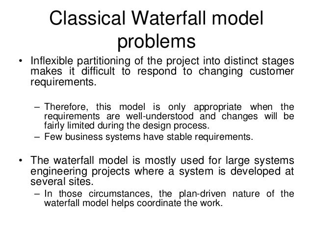 29. 29. Classical Waterfall model problems • Inflexible partitioning of the project into distinct stages makes it difficult to respond to changing customer requirements. – Therefore, this model is only appropriate when the requirements are well-understood and changes will be fairly limited during the design process. – Few business systems have stable requirements. • The waterfall model is mostly used for large systems engineering projects where a system is developed at several sites. – In those circumstances, the plan-driven nature of the waterfall model helps coordinate the work.