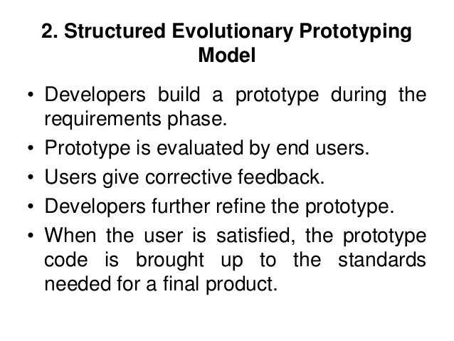 30. 30. 2. Structured Evolutionary Prototyping Model • Developers build a prototype during the requirements phase. • Prototype is evaluated by end users. • Users give corrective feedback. • Developers further refine the prototype. • When the user is satisfied, the prototype code is brought up to the standards needed for a final product.