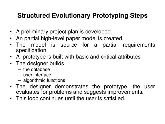 31. 31. Structured Evolutionary Prototyping Steps • A preliminary project plan is developed. • An partial high-level paper model is created. • The model is source for a partial requirements specification. • A prototype is built with basic and critical attributes • The designer builds – the database – user interface – algorithmic functions • The designer demonstrates the prototype, the user evaluates for problems and suggests improvements. • This loop continues until the user is satisfied.