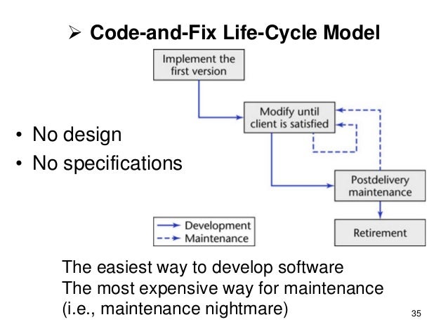 35. 35. 35  Code-and-Fix Life-Cycle Model The easiest way to develop software The most expensive way for maintenance (i.e., maintenance nightmare) • No design • No specifications