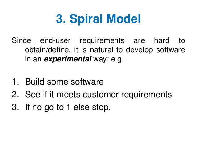 37. 37. 3. Spiral Model Since end-user requirements are hard to obtain/define, it is natural to develop software in an experimental way: e.g. 1. Build some software 2. See if it meets customer requirements 3. If no go to 1 else stop.