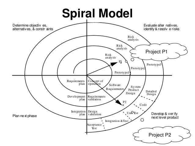 41. 41. Spiral Model Determine objectiv es, alternatives, & constr aints Evaluate alter natives, identify& resolv e r isks Develop & ver ify next level productPlan next phase Requirements Development Integration plan plan plan Requirements Design validation validation Software System Product Risk analysis Risk analysis Prototype1 Prototype2 Prototype3 Risk analysis Concept of operation Requirements Design Code Unit Test Integration &Test Acceptance Detailed Design P1 P2 Test Project P1 Project P2