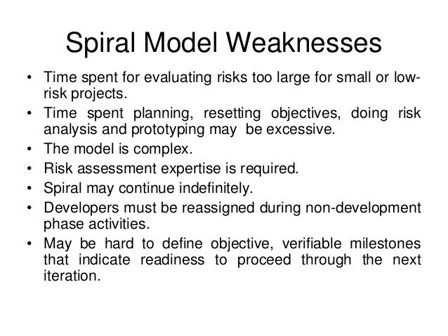 48. 48. Spiral Model Weaknesses • Time spent for evaluating risks too large for small or low- risk projects. • Time spent planning, resetting objectives, doing risk analysis and prototyping may be excessive. • The model is complex. • Risk assessment expertise is required. • Spiral may continue indefinitely. • Developers must be reassigned during non-development phase activities. • May be hard to define objective, verifiable milestones that indicate readiness to proceed through the next iteration.