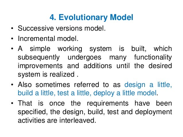 49. 49. 4. Evolutionary Model • Successive versions model. • Incremental model. • A simple working system is built, which subsequently undergoes many functionality improvements and additions until the desired system is realized . • Also sometimes referred to as design a little, build a little, test a little, deploy a little model. • That is once the requirements have been specified, the design, build, test and deployment activities are interleaved.