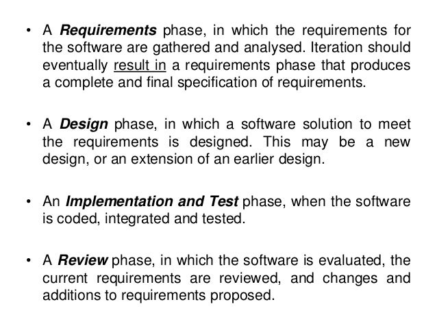 54. 54. • A Requirements phase, in which the requirements for the software are gathered and analysed. Iteration should eventually result in a requirements phase that produces a complete and final specification of requirements. • A Design phase, in which a software solution to meet the requirements is designed. This may be a new design, or an extension of an earlier design. • An Implementation and Test phase, when the software is coded, integrated and tested. • A Review phase, in which the software is evaluated, the current requirements are reviewed, and changes and additions to requirements proposed.
