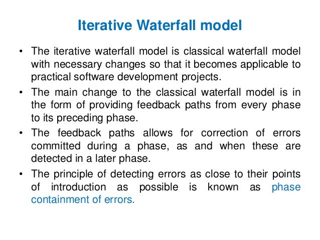 55. 55. Iterative Waterfall model • The iterative waterfall model is classical waterfall model with necessary changes so that it becomes applicable to practical software development projects. • The main change to the classical waterfall model is in the form of providing feedback paths from every phase to its preceding phase. • The feedback paths allows for correction of errors committed during a phase, as and when these are detected in a later phase. • The principle of detecting errors as close to their points of introduction as possible is known as phase containment of errors.