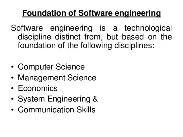 6. 6. Foundation of Software engineering Software engineering is a technological discipline distinct from, but based on the foundation of the following disciplines: • Computer Science • Management Science • Economics • System Engineering & • Communication Skills