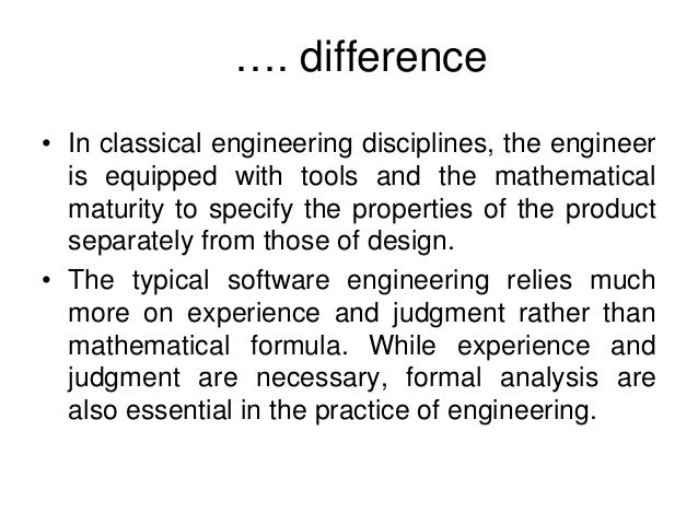 9. 9. …. difference • In classical engineering disciplines, the engineer is equipped with tools and the mathematical maturity to specify the properties of the product separately from those of design. • The typical software engineering relies much more on experience and judgment rather than mathematical formula. While experience and judgment are necessary, formal analysis are also essential in the practice of engineering.