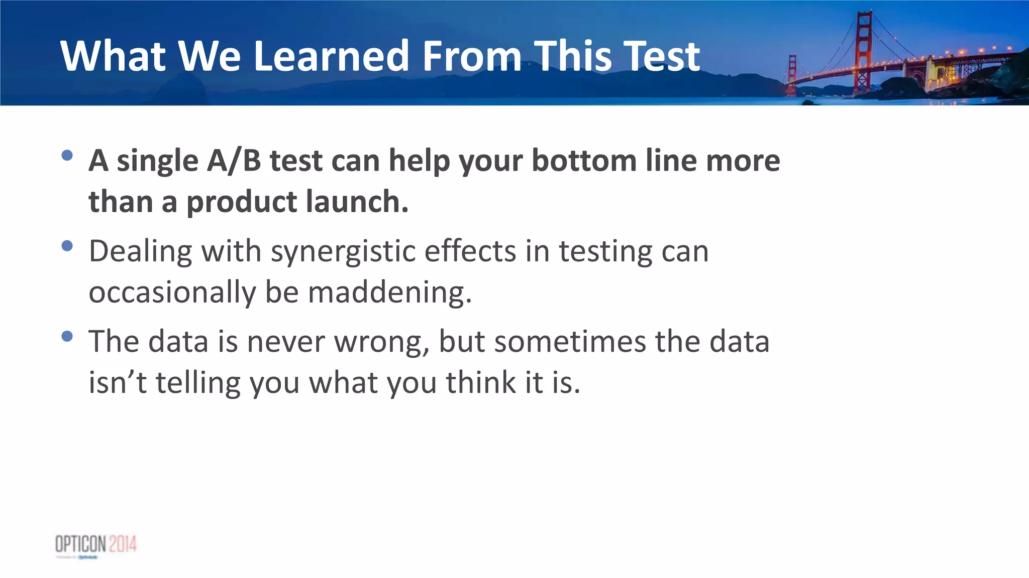 10. 10. What We Learned From This Test • A single A/B test can help your bottom line more than a product launch. • Dealing with synergistic effects in testing can occasionally be maddening. • The data is never wrong, but sometimes the data isn’t telling you what you think it is.