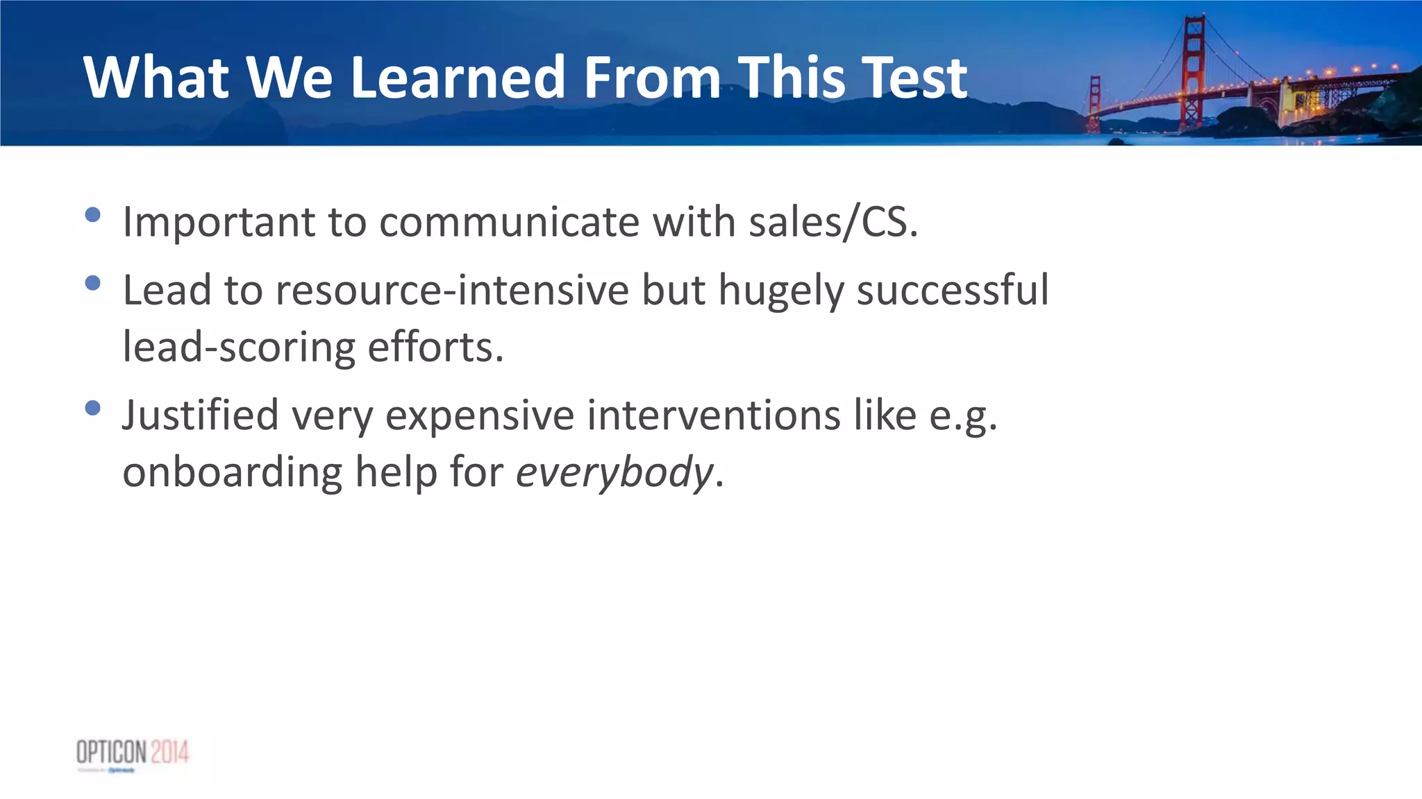 14. 14. What We Learned From This Test • Important to communicate with sales/CS. • Lead to resource-intensive but hugely successful lead-scoring efforts. • Justified very expensive interventions like e.g. onboarding help for everybody.