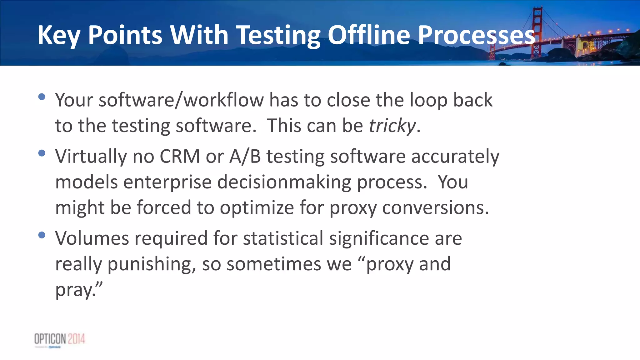 22. 22. Key Points With Testing Offline Processes • Your software/workflow has to close the loop back to the testing software. This can be tricky. • Virtually no CRM or A/B testing software accurately models enterprise decisionmaking process. You might be forced to optimize for proxy conversions. • Volumes required for statistical significance are really punishing, so sometimes we “proxy and pray.”