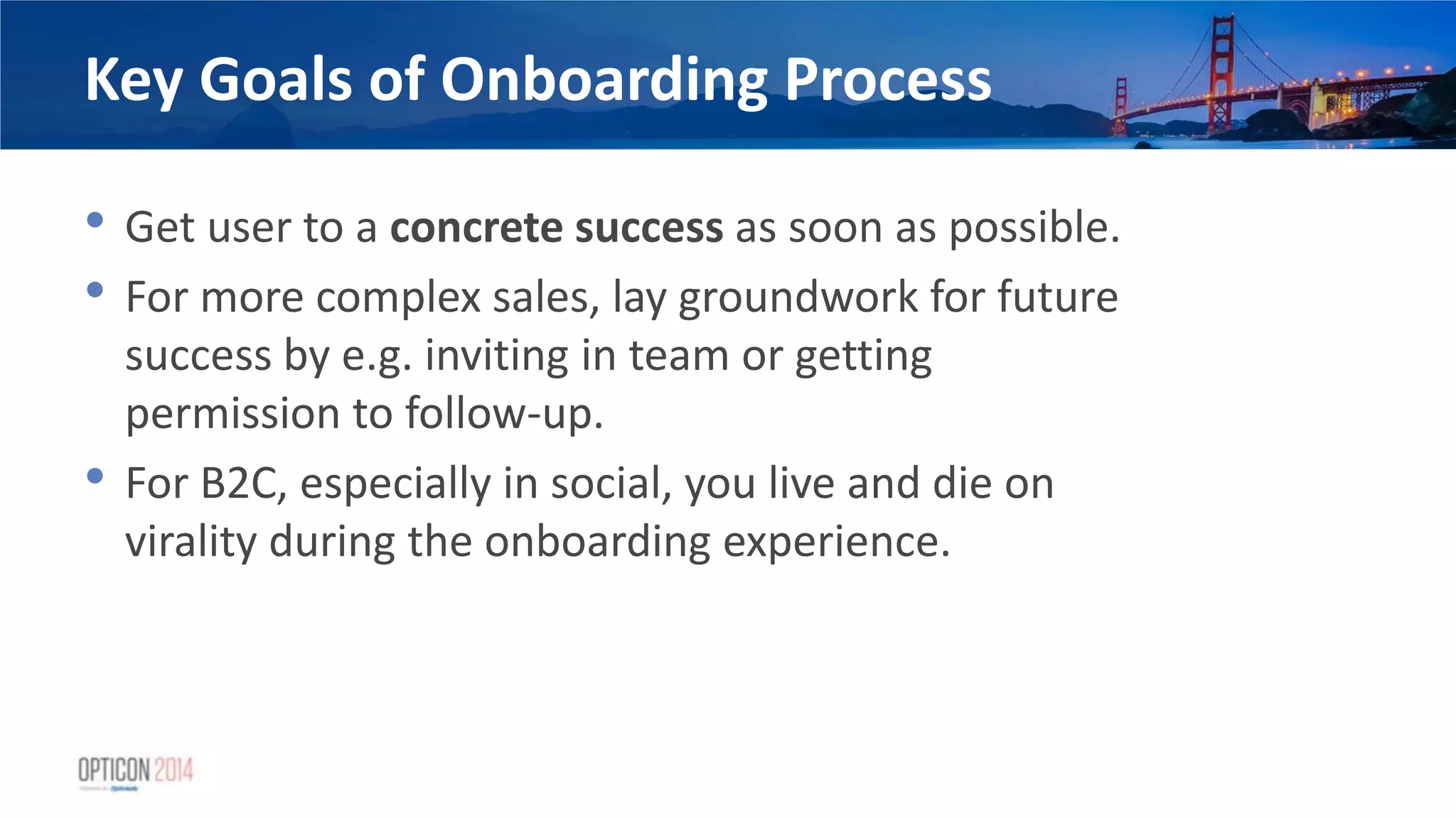 18. 18. Key Goals of Onboarding Process • Get user to a concrete success as soon as possible. • For more complex sales, lay groundwork for future success by e.g. inviting in team or getting permission to follow-up. • For B2C, especially in social, you live and die on virality during the onboarding experience.