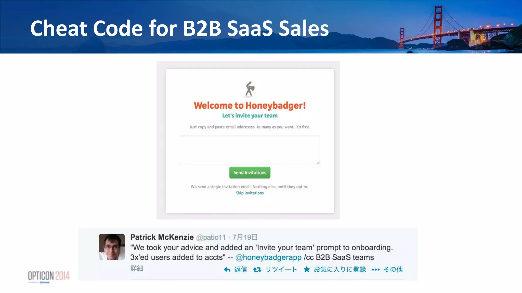 42. 42. Thanks for Listening! • I love talking about this and you cannot possibly waste my time: @patio11 or patrick@kalzumeus.com • Free email mini-course on CRO in software companies: http://bit.ly/patrick-optimizely • Liked this presentation? I deliver something like this twice a month, free, to my email list. http://training.kalzumeus.com to sign up