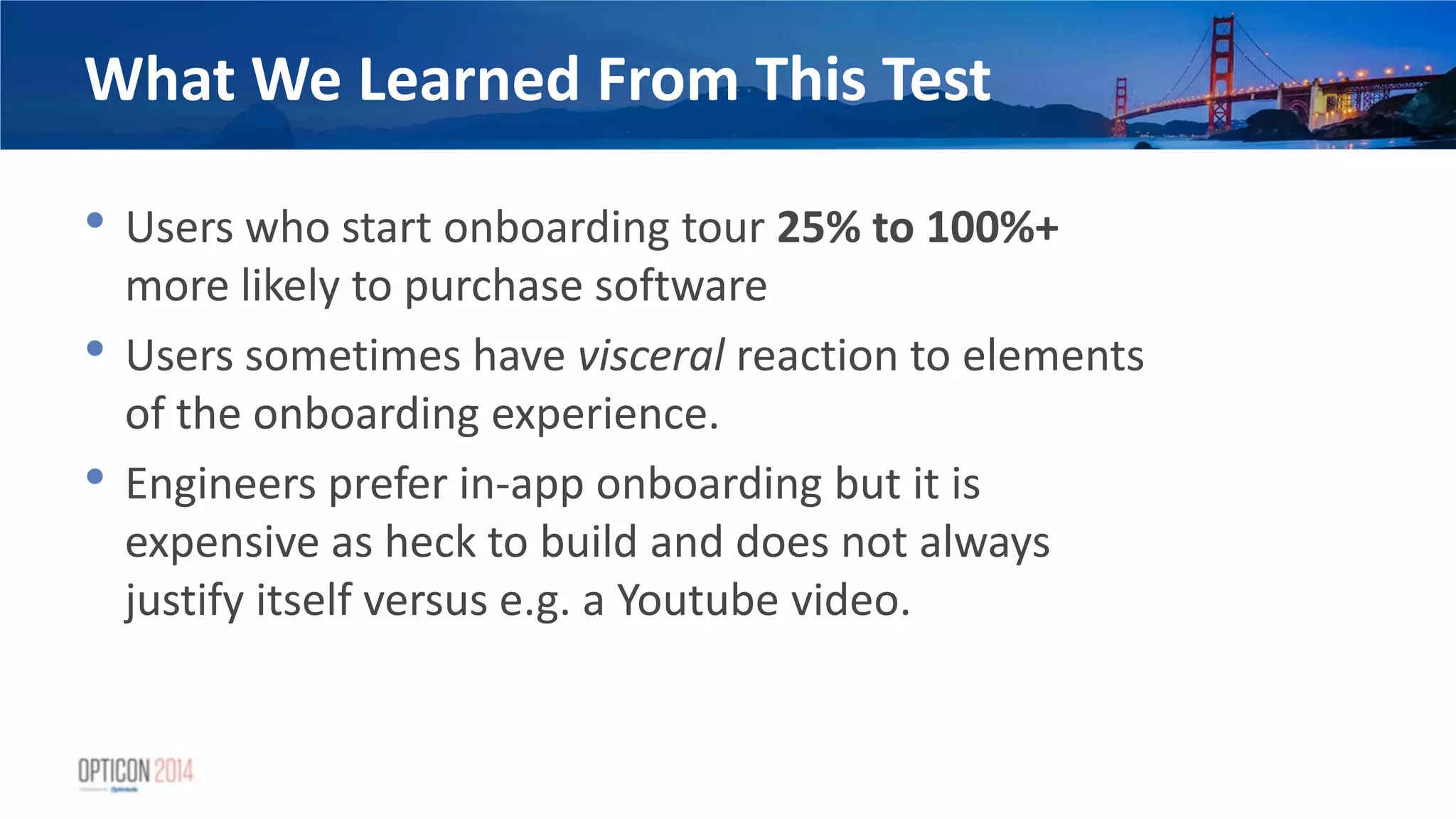 21. 21. What We Learned From This Test • Users who start onboarding tour 25% to 100%+ more likely to purchase software • Users sometimes have visceral reaction to elements of the onboarding experience. • Engineers prefer in-app onboarding but it is expensive as heck to build and does not always justify itself versus e.g. a Youtube video.