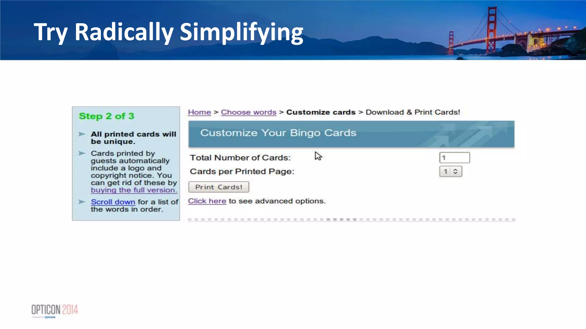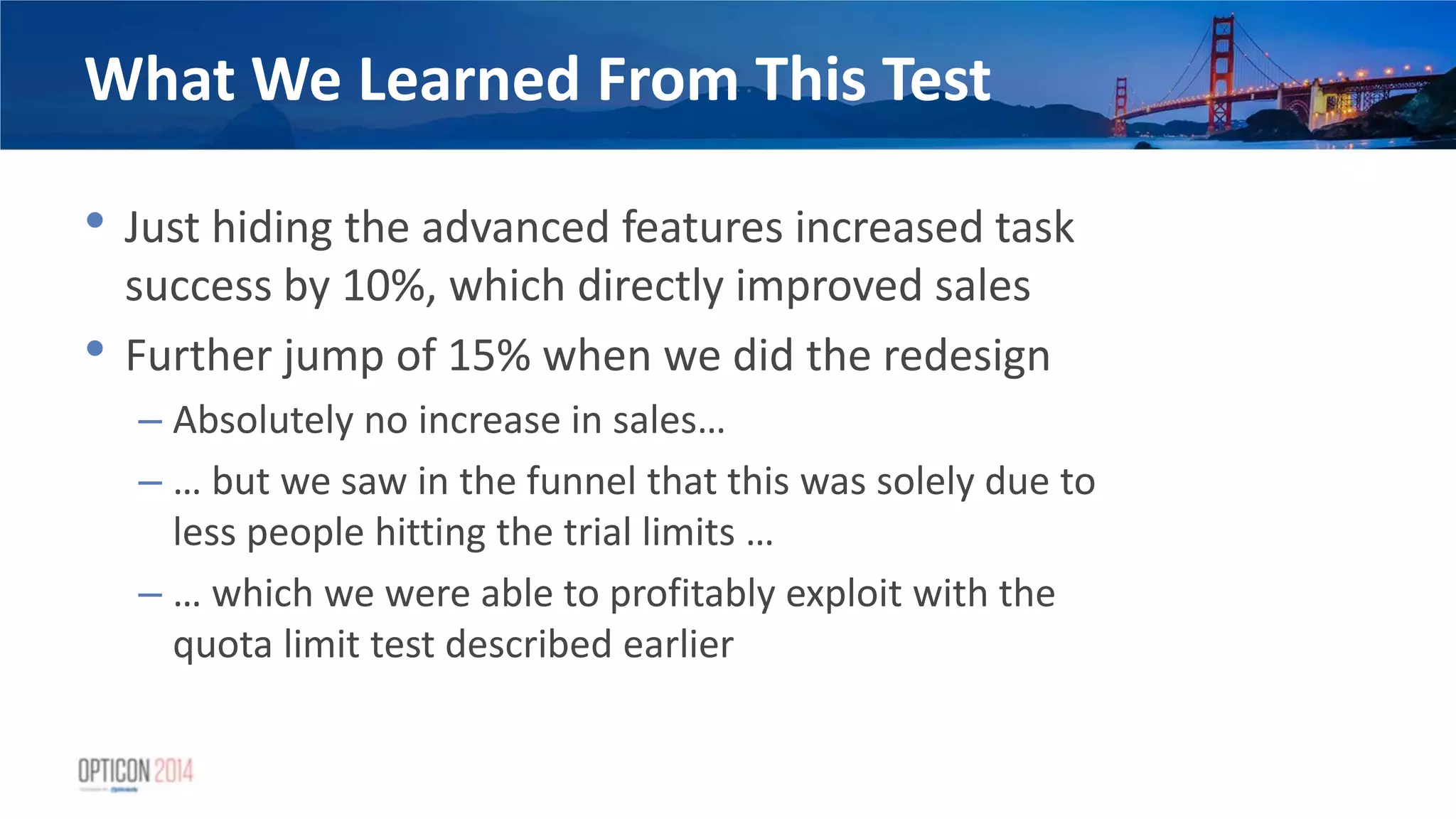 28. 28. What We Learned From This Test • Just hiding the advanced features increased task success by 10%, which directly improved sales • Further jump of 15% when we did the redesign – Absolutely no increase in sales… – … but we saw in the funnel that this was solely due to less people hitting the trial limits … – … which we were able to profitably exploit with the quota limit test described earlier