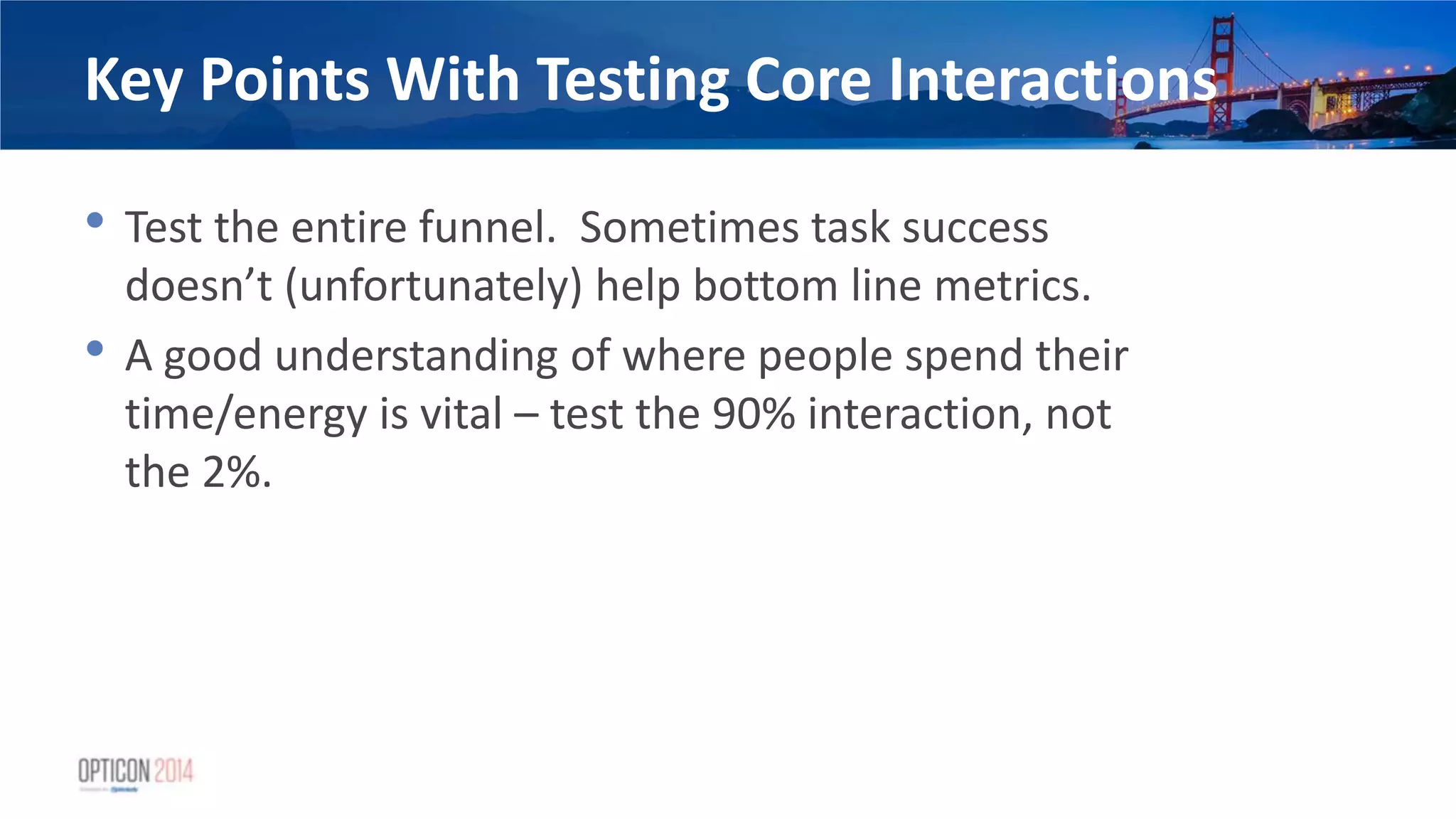 29. 29. Key Points With Testing Core Interactions • Test the entire funnel. Sometimes task success doesn’t (unfortunately) help bottom line metrics. • A good understanding of where people spend their time/energy is vital – test the 90% interaction, not the 2%.