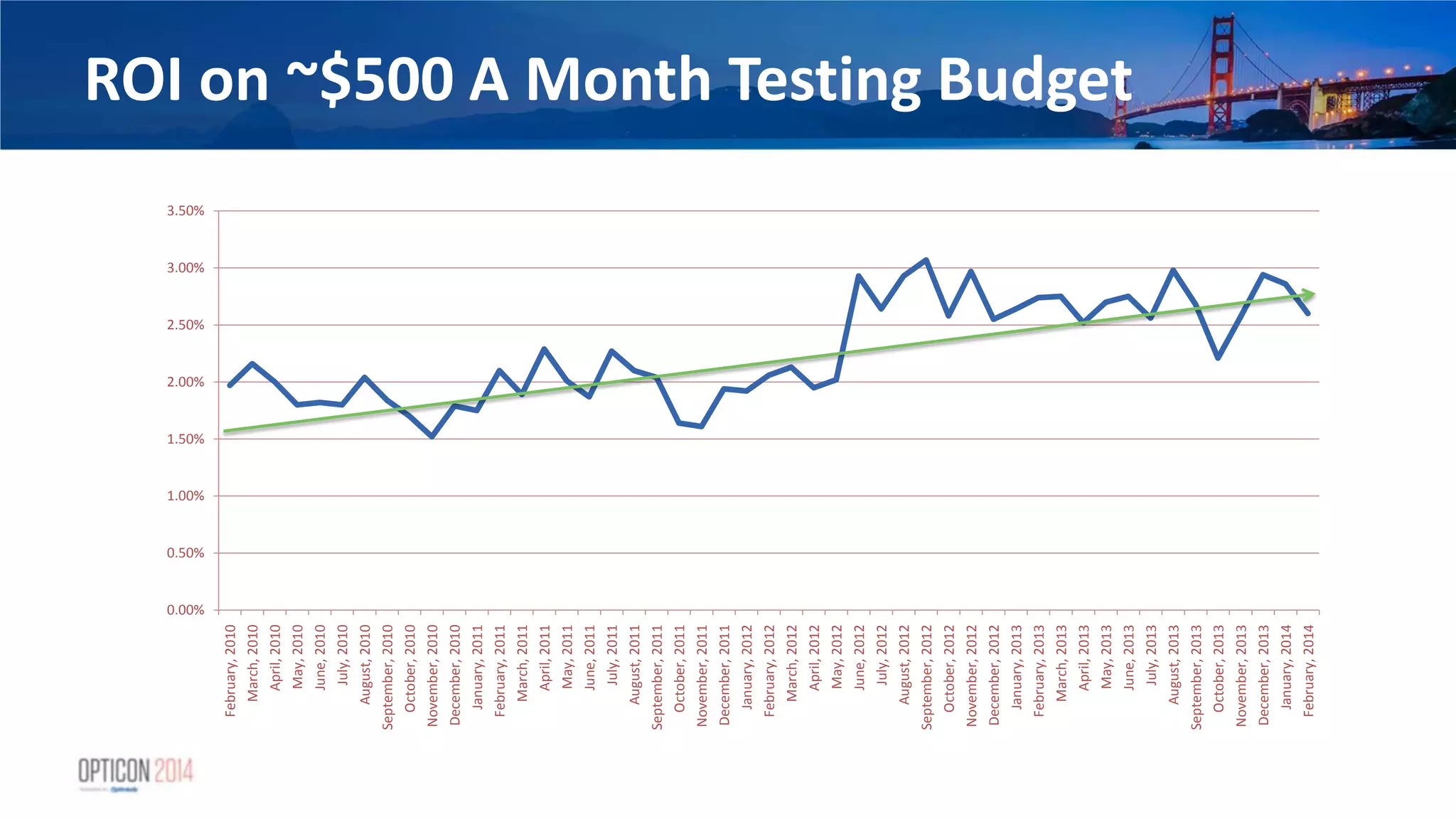 30. 30. ROI on ~$500 A Month Testing Budget 0.00% 0.50% 1.00% 1.50% 2.00% 2.50% 3.00% 3.50% February,2010 March,2010 April,2010 May,2010 June,2010 July,2010 August,2010 September,2010 October,2010 November,2010 December,2010 January,2011 February,2011 March,2011 April,2011 May,2011 June,2011 July,2011 August,2011 September,2011 October,2011 November,2011 December,2011 January,2012 February,2012 March,2012 April,2012 May,2012 June,2012 July,2012 August,2012 September,2012 October,2012 November,2012 December,2012 January,2013 February,2013 March,2013 April,2013 May,2013 June,2013 July,2013 August,2013 September,2013 October,2013 November,2013 December,2013 January,2014 February,2014