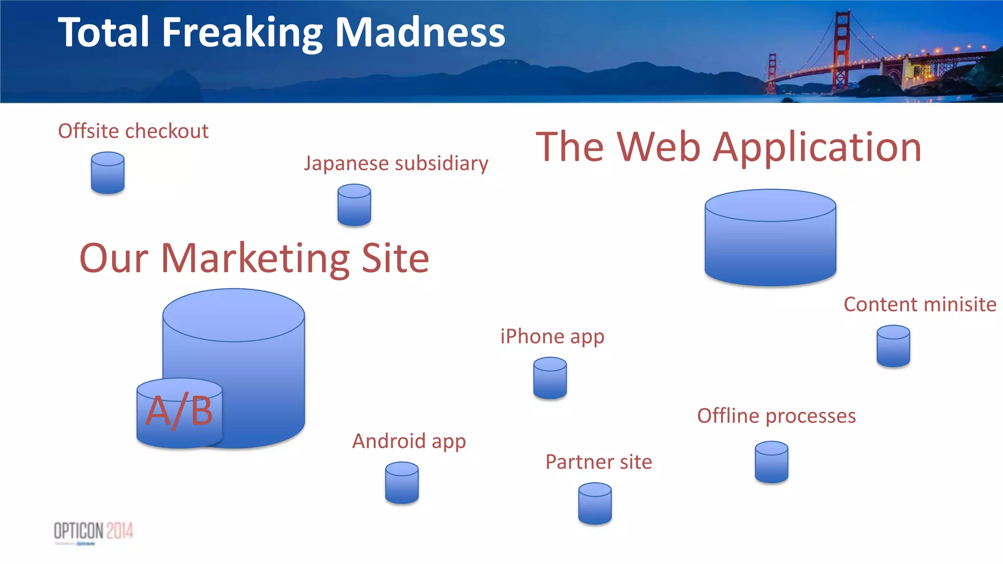 35. 35. Total Freaking Madness Our Marketing Site A/B The Web Application iPhone app Offline processes Android app Partner site Content minisite Offsite checkout Japanese subsidiary