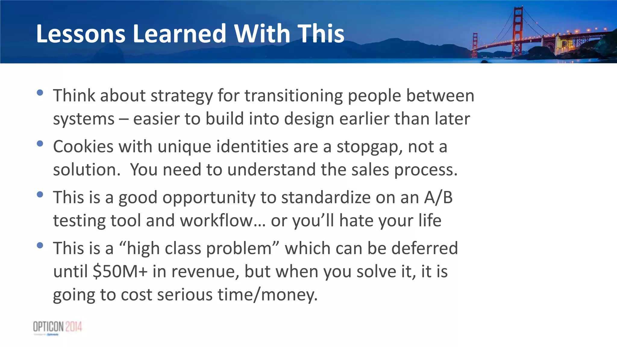 37. 37. Lessons Learned With This • Think about strategy for transitioning people between systems – easier to build into design earlier than later • Cookies with unique identities are a stopgap, not a solution. You need to understand the sales process. • This is a good opportunity to standardize on an A/B testing tool and workflow… or you’ll hate your life • This is a “high class problem” which can be deferred until $50M+ in revenue, but when you solve it, it is going to cost serious time/money.
