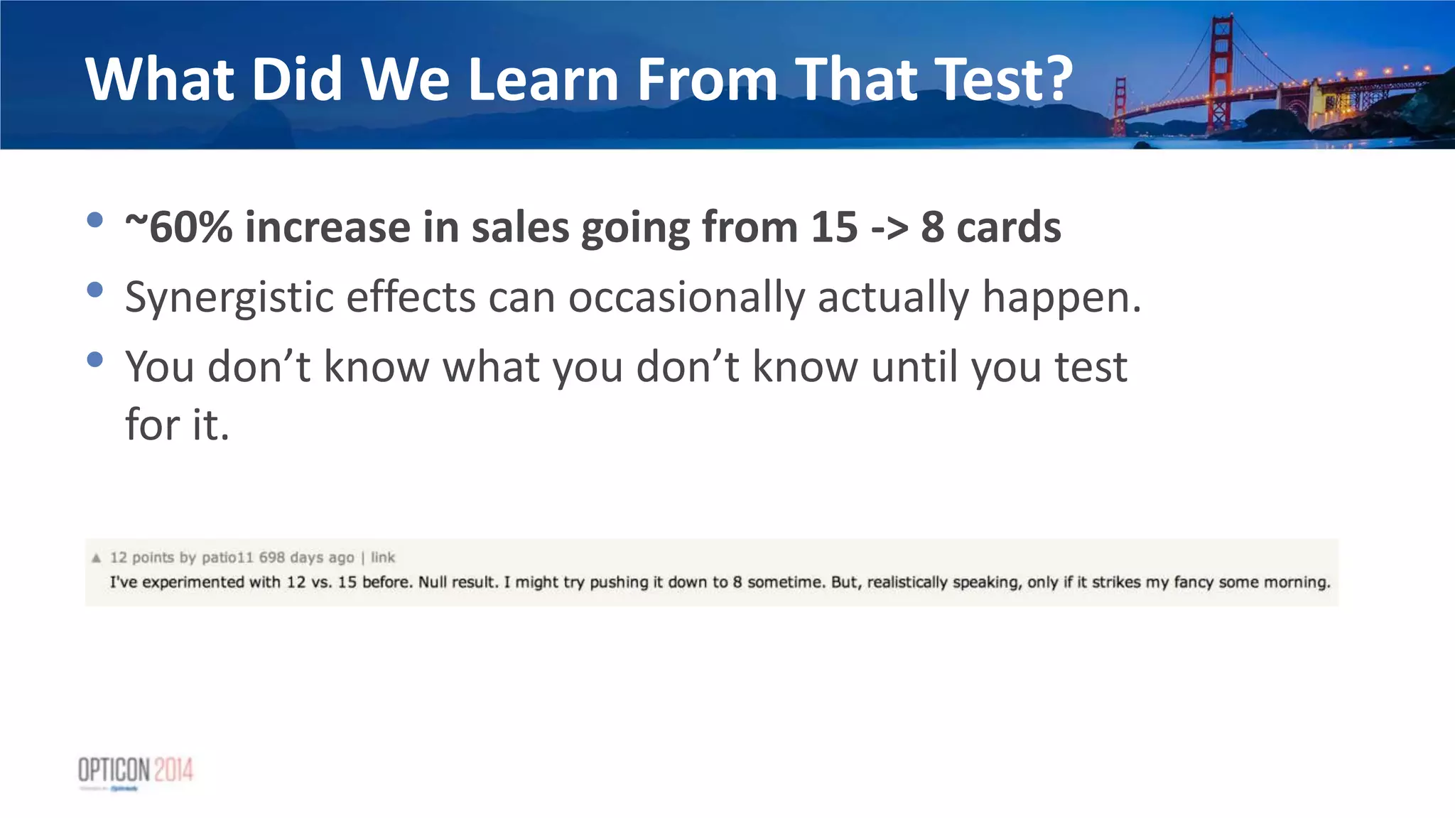 5. 5. What Did We Learn From That Test? • ~60% increase in sales going from 15 -> 8 cards • Synergistic effects can occasionally actually happen. • You don’t know what you don’t know until you test for it.