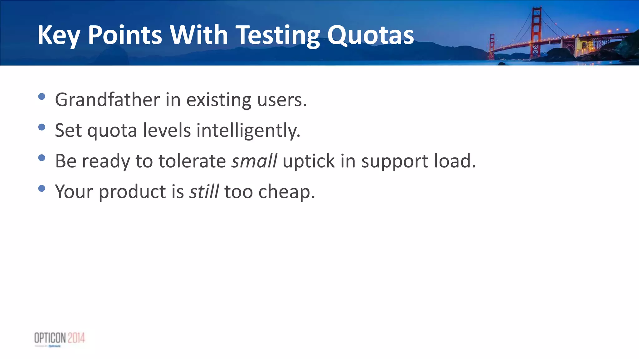 6. 6. Key Points With Testing Quotas • Grandfather in existing users. • Set quota levels intelligently. • Be ready to tolerate small uptick in support load. • Your product is still too cheap.