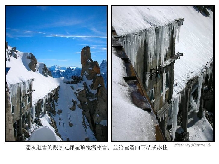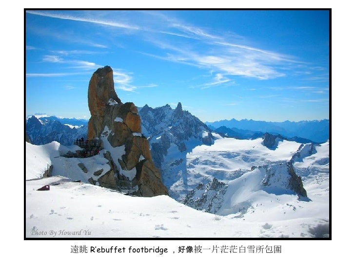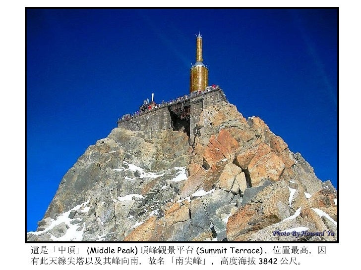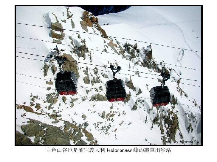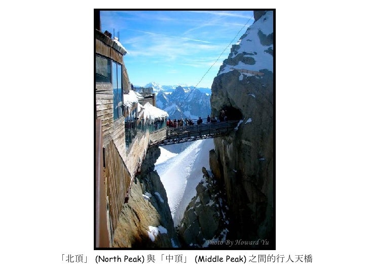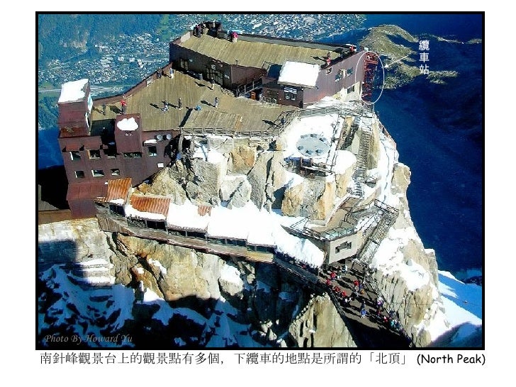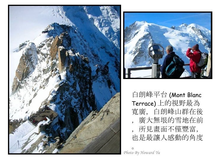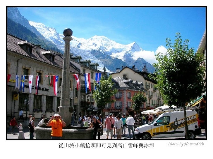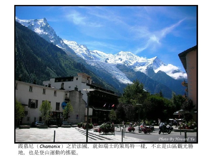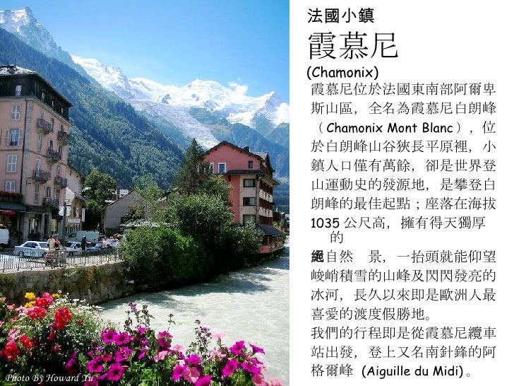 2. 2. 法國小鎮 霞慕尼 (Chamonix) <ul><li>霞慕尼位於法國東南部阿爾卑 </li></ul><ul><li>斯山區,全名為霞慕尼白朗峰 </li></ul><ul><li>( Chamonix Mont Blanc ), 位 </li></ul><ul><li>於白朗峰山谷狹長平原裡,小 </li></ul><ul><li>鎮人口僅有萬餘,卻是世界登 </li></ul><ul><li>山運動史的發源地,是攀登白 </li></ul><ul><li>朗峰的最佳起點;座落在海拔 </li></ul><ul><li>1035 公尺高,擁有得天獨厚的 </li></ul><ul><li>大自然絕景,一抬頭就能仰望 </li></ul><ul><li>峻峭積雪的山峰及閃閃發亮的 </li></ul><ul><li>冰河,長久以來即是歐洲人最 </li></ul><ul><li>喜愛的渡度假勝地。 </li></ul><ul><li>我們的行程即是從霞慕尼纜車 </li></ul><ul><li>站出發,登上又名南針鋒的阿 </li></ul><ul><li>格爾峰 (Aiguille du Midi) 。 </li></ul>Photo By Howard Yu