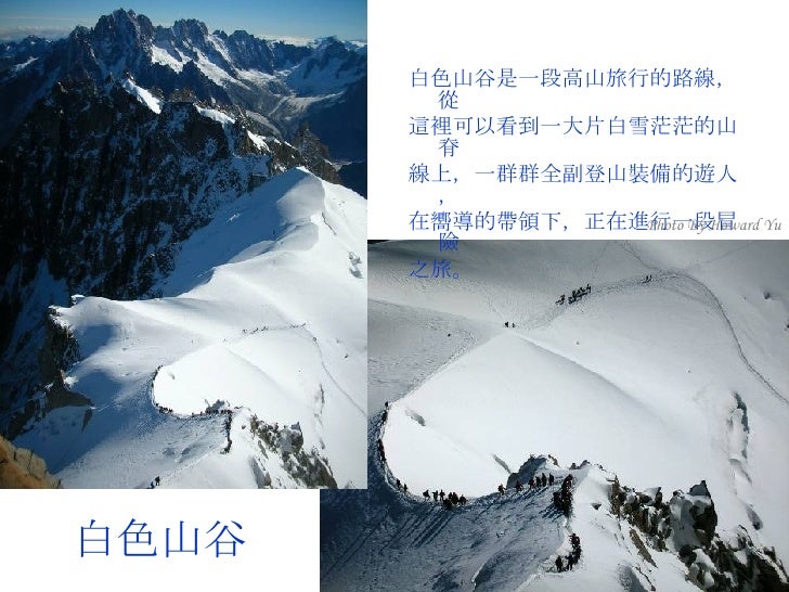 15. 15. 白色山谷 <ul><li>白色山谷是一段高山旅行的路線,從 </li></ul><ul><li>這裡可以看到一大片白雪茫茫的山脊 </li></ul><ul><li>線上,一群群全副登山裝備的遊人, </li></ul><ul><li>在嚮導的帶領下,正在進行一段冒險 </li></ul><ul><li>之旅。 </li></ul>Photo By Howard Yu