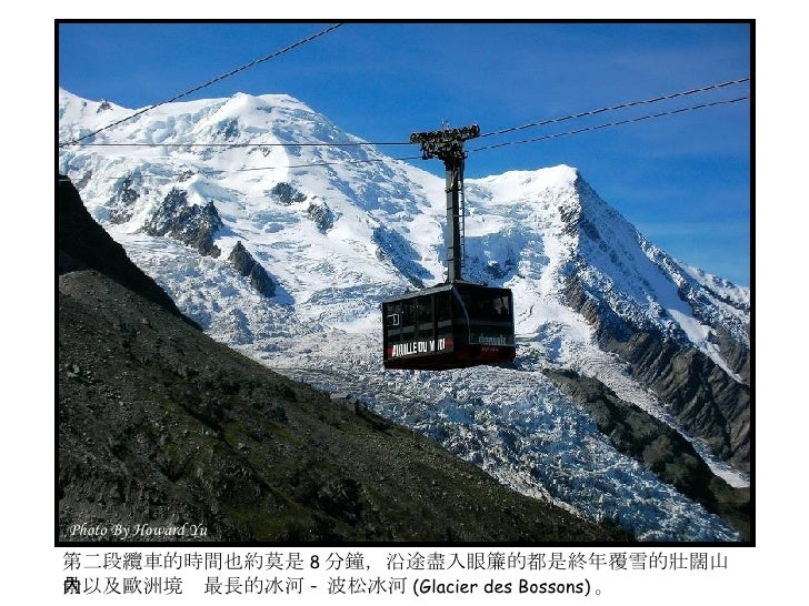 7. 7. 第二段纜車的時間也約莫是 8 分鐘,沿途盡入眼簾的都是終年覆雪的壯闊山景以及歐洲境內最長的冰河 - 波松冰河 (Glacier des Bossons) 。 Photo By Howard Yu