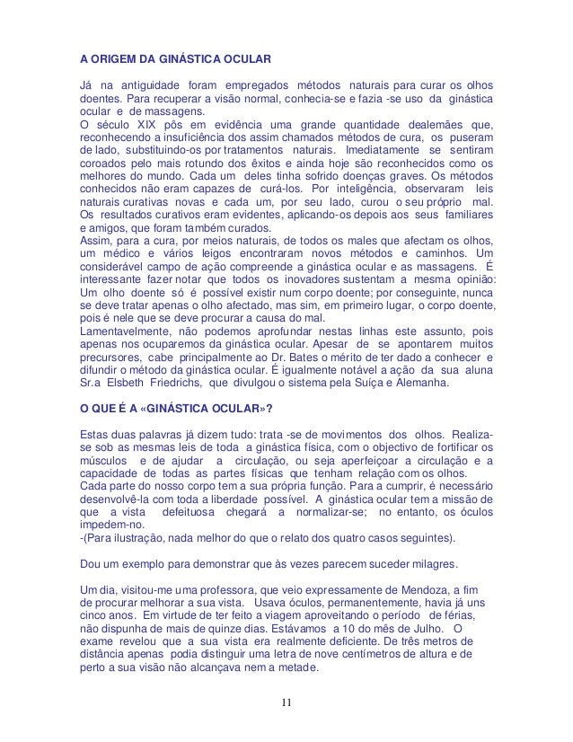 11. 11. 11 A ORIGEM DA GINÁSTICA OCULAR Já na antiguidade foram empregados métodos naturais para curar os olhos doentes. Para recuperar a visão normal, conhecia-se e fazia -se uso da ginástica ocular e de massagens. O século XIX pôs em evidência uma grande quantidade dealemães que, reconhecendo a insuficiência dos assim chamados métodos de cura, os puseram de lado, substituindo-os por tratamentos naturais. Imediatamente se sentiram coroados pelo mais rotundo dos êxitos e ainda hoje são reconhecidos como os melhores do mundo. Cada um deles tinha sofrido doenças graves. Os métodos conhecidos não eram capazes de curá-los. Por inteligência, observaram leis naturais curativas novas e cada um, por seu lado, curou o seu próprio mal. Os resultados curativos eram evidentes, aplicando-os depois aos seus familiares e amigos, que foram também curados. Assim, para a cura, por meios naturais, de todos os males que afectam os olhos, um médico e vários leigos encontraram novos métodos e caminhos. Um considerável campo de ação compreende a ginástica ocular e as massagens. É interessante fazer notar que todos os inovadores sustentam a mesma opinião: Um olho doente só é possível existir num corpo doente; por conseguinte, nunca se deve tratar apenas o olho afectado, mas sim, em primeiro lugar, o corpo doente, pois é nele que se deve procurar a causa do mal. Lamentavelmente, não podemos aprofundar nestas linhas este assunto, pois apenas nos ocuparemos da ginástica ocular. Apesar de se apontarem muitos precursores, cabe principalmente ao Dr. Bates o mérito de ter dado a conhecer e difundir o método da ginástica ocular. É igualmente notável a ação da sua aluna Sr.a Elsbeth Friedrichs, que divulgou o sistema pela Suíça e Alemanha. O QUE É A «GINÁSTICA OCULAR»? Estas duas palavras já dizem tudo: trata -se de movimentos dos olhos. Realiza- se sob as mesmas leis de toda a ginástica física, com o objectivo de fortificar os músculos e de ajudar a circulação, ou seja aperfeiçoar a circulação e a capacidade de todas as partes físicas que tenham relação com os olhos. Cada parte do nosso corpo tem a sua própria função. Para a cumprir, é necessário desenvolvê-la com toda a liberdade possível. A ginástica ocular tem a missão de que a vista defeituosa chegará a normalizar-se; no entanto, os óculos impedem-no. -(Para ilustração, nada melhor do que o relato dos quatro casos seguintes). Dou um exemplo para demonstrar que às vezes parecem suceder milagres. Um dia, visitou-me uma professora, que veio expressamente de Mendoza, a fim de procurar melhorar a sua vista. Usava óculos, permanentemente, havia já uns cinco anos. Em virtude de ter feito a viagem aproveitando o período de férias, não dispunha de mais de quinze dias. Estávamos a 10 do mês de Julho. O exame revelou que a sua vista era realmente deficiente. De três metros de distância apenas podia distinguir uma letra de nove centímetros de altura e de perto a sua visão não alcançava nem a metade.