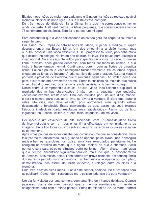 12. 12. 12 Ela deu nove lições de meia hora cada uma e já na quinta lição se registou notável melhoria. No final da nona lição, a sua vista estava corrigida. De três metros de distância, lia a última linha que lhe corresponde e, melhor ainda, de perto. A 90 centímetros lia letras pequenas, que correspondem a ver de 75 centímetros de distância. Este êxito parece um milagre! Para demonstrar que a visão corresponde ao estado geral do corpo físico, relato o seguinte caso: Um aluno meu, rapaz de catorze anos de idade, cujo pai é médico. O rapaz desejava entrar na Escola Militar. Um dos olhos tinha a visão normal, mas o outro possuía uma visão deficiente. O seu progresso foi lento, pois tinha muito que estudar no colégio. No fim do ano escolar, fal tava -lhe pouco para alcançar a visão normal. No ano seguinte voltou para aperfeiçoar a vista. Sucedeu o que se tinha previsto: após grande descanso, com férias passadas no campo, a sua visão tinha-se tornado normal. Continuava, porém, com as lições de ginástica ocular. Pouco a pouco, a vista começou a falhar novamente. Pouco tempo depois, chegaram as férias de Inverno. A criança, livre de todo o estudo, fez uma viagem por toda a província de Córdoba, que durou duas semanas. Ao voltar desta via gem, a sua visão era novamente normal. Então intensificou-se, mais do que nunca, o seu trabalho escolar, pois à noite ainda assistia a lições num colégio. Nessa altura já compreendia a causa da sua visão insu ficiente e expliquei o resultado das minhas observações à mãe, com a seguinte recomendação: «Antes dos exames, afaste o seu filho dos estudos por uns oito dias; mande- o para o campo, para que, ao ar livre, se divirta à vontade. É claro que, durante estes oito dias, não deve estudar, pois aproveitará mais quando estiver descansado e fortalecido. Estou convencida de que, assim, os seus exames físicos e intelectuais darão resultados mais satisfatórios.» Assim foi, de fato. Ingressou na Escola Militar e nunca mais se queixou de má visão. Dei lições a um cavalheiro da alta sociedade, com 75 anos de idade. Sofria de hipermetropia e com um dos olhos tinha dificuldade em ver nitidamente as imagens. Tinha lido todos os livros sobre o assunto «exercícios oculares» e sabia- os de memória. Após umas poucas de lições que lhe dei, comunicou-me que se considerava muito feliz por me ter encontrado, pois, guiando-se apenas pelos livros, não conseguia realizar bem os exercícios, os quais, uma vez executados perfeitamente, lhe corrigiam os defeitos da vista, que é agora melhor do que a chamada «vista normal», seja para objectos situados perto ou longe. Além disso, manifestou que o ter-me encontrado significava para ele mais do que o descobrimento da América. Seis meses antes, tinha sofrido um grave acidente, em consequência do qual tinha perdido muito a memória. Também esta a recuperou por com pleto, demonstrando- nos assim, de forma evidente, a relação entre os olhos e a memória. Uma vez escritas estas linhas, li-as a este senhor, pedindo -lhe autorização para as publicar! «Como não - respondeu-me -, pois se tudo isso é a pura verdade!» Um dia fui visitada por uma senhora com uma filha de 14 anos de idade. Quando passaram diante de mim, percebi que a menina manifestava um evidente antagonismo para com a minha pessoa. Sofria de miopia de 3/4 da visão normal