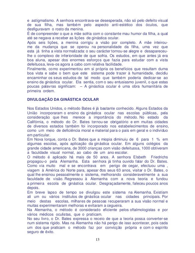 13. 13. 13 e astigmatismo. A senhora encontrava-se desesperada, não só pelo defeito visual de sua filha, mas também pelo aspecto anti-estético dos óculos, que desfiguravam o rosto da menina. É de compreender o que a mãe sofria com o constante mau humor da filha, a qual até se negava a receber as lições de ginástica ocular. Após seis lições, a menina corrigiu a visão por completo. A mãe inteirou- me da mudança que se operou na personalidade da filha, uma vez que esta já tinha a vista normalizada: o seu carácter tornou-se alegre e desapareceu- lhe o complexo de inferioridade de que sofria. Os estudos, em que antes já era boa aluna, apesar dos enormes esforços que fazia para estudar com a vista defeituosa, leva-os agora a cabo com relativa facilidade. Finalmente, como experimentou em si própria os benefícios que resultam duma boa vista e sabe o bem que este sistema pode trazer à humanidade, decidiu encaminhar os seus estudos de tal modo que também poderia dedicar-se ao ensino da ginástica ocular. Ela sentia, com o seu entusiasmo juvenil, o que estas poucas palavras significam: – A ginástica ocular é uma obra humanitária de primeira ordem. DIVULGAÇÃO DA GINÁSTICA OCULAR Nos Estados Unidos, o método Bates é já bastante conhecido. Alguns Estados da União incorporaram o ensino da ginástica ocular nas escolas públicas, pela consideração que lhes merece a importância do método. No estado da Califórnia, o método do Dr. Bates tornou-se obrigatório e em muitas cidades de diversos estados também foi incorporado nos estabelecimentos de ensino, como um meio de deficiência moral e material para o país em geral e o indivíduo em particular. Em Nova Iorque, conta o Dr. Bates que a miopia diminuiu de 6 para 1 % em algumas escolas, após aplicação da ginástica ocular. Em alguns colégios da grande cidade americana, de 3000 crianças com visão defeituosa, 1000 obtiveram a faculdade visual normal, ao cabo de um ano escolar. O método é aplicado há mais de 50 anos. A senhora Elsbeth Friedrichs propagou-o pela Alemanha. Esta senhora já tinha ouvido falar do Dr. Bates. Como via muito mal e se encontrava em perigo de cegar, efectuou uma , viagem à América do Norte para, apesar dos seus 63 anos, visitar o Dr. Bates, o qual lhe ensinou pessoalmente o sistema, melhorando consideravelmente a sua faculdade de visão. Regressou à Alemanha com a nova teoria e fundou a primeira escola de ginástica ocular. Desgraçadamente, faleceu poucos anos depois. Em breve lapso de tempo se divulgou este sistema na Alemanha. Existiam ali um ou vários institutos de ginástica ocular nas cidades principais. Por meio destas escolas, milhares de pessoas recuperaram a sua visão normal e muitas experimentaram melhoras e evitaram a cegueira. Na Alemanha, o método é considerado eficiente pelos oftalmologistas e por vários médicos oculistas, que o praticam. No seu livro, o Dr. Bates expressa o receio de que a teoria possa converter-se num sistema rígido. Mas na Alemanha não há perigo de isso acontecer, pois cada um dos que praticam o método faz por convicção própria e com o espírito seguro de êxito.