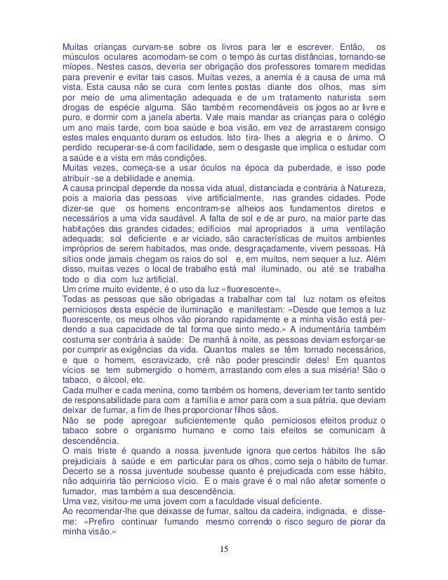 15. 15. 15 Muitas crianças curvam-se sobre os livros para ler e escrever. Então, os músculos oculares acomodam-se com o tempo às curtas distâncias, tornando-se míopes. Nestes casos, deveria ser obrigação dos professores tomarem medidas para prevenir e evitar tais casos. Muitas vezes, a anemia é a causa de uma má vista. Esta causa não se cura com lentes postas diante dos olhos, mas sim por meio de uma alimentação adequada e de um tratamento naturista sem drogas de espécie alguma. São também recomendáveis os jogos ao ar livre e puro, e dormir com a janela aberta. Vale mais mandar as crianças para o colégio um ano mais tarde, com boa saúde e boa visão, em vez de arrastarem consigo estes males enquanto duram os estudos. Isto tira- lhes a alegria e o ânimo. O perdido recuperar-se-á com facilidade, sem o desgaste que implica o estudar com a saúde e a vista em más condições. Muitas vezes, começa-se a usar óculos na época da puberdade, e isso pode atribuir -se a debilidade e anemia. A causa principal depende da nossa vida atual, distanciada e contrária à Natureza, pois a maioria das pessoas vive artificialmente, nas grandes cidades. Pode dizer-se que os homens encontram-se alheios aos fundamentos diretos e necessários a uma vida saudável. A falta de sol e de ar puro, na maior parte das habitações das grandes cidades; edifícios mal apropriados a uma ventilação adequada; sol deficiente e ar viciado, são características de muitos ambientes impróprios de serem habitados, mas onde, desgraçadamente, vivem pessoas. Há sítios onde jamais chegam os raios do sol e, em muitos, nem sequer a luz. Além disso, muitas vezes o local de trabalho está mal iluminado, ou até se trabalha todo o dia com luz artificial. Um crime muito evidente, é o uso da luz «fluorescente». Todas as pessoas que são obrigadas a trabalhar com tal luz notam os efeitos perniciosos desta espécie de iluminação e manifestam: «Desde que temos a luz fluorescente, os meus olhos vão piorando rapidamente e a minha visão está per- dendo a sua capacidade de tal forma que sinto medo.» A indumentária também costuma ser contrária à saúde: De manhã à noite, as pessoas deviam esforçar-se por cumprir as exigências da vida. Quantos males se têm tornado necessários, e que o homem, escravizado, crê não poder prescindir deles! Em quantos vícios se tem submergido o homem, arrastando com eles a sua miséria! São o tabaco, o álcool, etc. Cada mulher e cada menina, como também os homens, deveriam ter tanto sentido de responsabilidade para com a família e amor para com a sua pátria, que deviam deixar de fumar, a fim de lhes proporcionar filhos sãos. Não se pode apregoar suficientemente quão perniciosos efeitos produz o tabaco sobre o organismo humano e como tais efeitos se comunicam à descendência. O mais triste é quando a nossa juventude ignora que certos hábitos lhe são prejudiciais à saúde e em particular para os olhos, como seja o hábito de fumar. Decerto se a nossa juventude soubesse quanto é prejudicada com esse hábito, não adquiriria tão pernicioso vício. E o mais grave é o mal não afetar somente o fumador, mas também a sua descendência. Uma vez, visitou-me uma jovem com a faculdade visual deficiente. Ao recomendar-lhe que deixasse de fumar, saltou da cadeira, indignada, e disse- me: «Prefiro continuar fumando mesmo correndo o risco seguro de piorar da minha visão.»