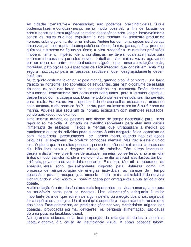 16. 16. 16 As cidades tornaram-se necessárias; não podemos prescindir delas. O que podemos fazer é conduzir-nos do melhor modo possível, a fim de buscarmos para a nossa natureza orgânica os meios necessários para reagir favoravelmente contra os males que nos espreitam e nos rodeiam. O ambiente, produto do homem, submerge-o na dor e na tristeza. Ambientes com emanações de diversas naturezas; ar impuro pela decomposição de óleos, fumos, gases, naftas, produtos químicos e também de águas poluídas; a vida sedentária que muitas profissões impõem, ante o império de circunstâncias inevitáveis; locais acanhados para o número de pessoas que neles devem trabalhar, são muitas vezes agravados por se encontrar entre os trabalhadores alguém que emana exalações más, mórbidas, patológicas ou específicas de fácil infecção, que constituem lenta mas segura intoxicação para as pessoas saudáveis, que desgraçadamente devem inalá -las. Muita gente costuma levantar-se pela manhã, quando o sol já percorreu um largo trajecto no horizonte; são sobretudo os estudantes, que têm o costume de estudar de noite, ou seja nas horas mais necessárias ao descanso. Então dormem pela manhã, exactamente nas horas mais adequadas para o trabalho espiritual, despertando com a cabeça oca. Durante todo o dia, estes estudantes não servirão para muito. Por vezes tive a oportunidade de aconselhar estudantes, antes dos seus exames, a deitarem-se às 21 horas, para se levantarem às 5 ou 6 horas da manhã. Aqueles que seguiram tal horário, estudaram com melhores resultados, sendo aprovados nos exames. Uma imensa maioria de pessoas não dispõe de tempo necessário para fazer repouso ao meio-dia. A jornada de trabalho representa para eles uma cadeia ininterrupta de esforços físicos e mentais que ultrapassam a medida do rendimento que cada indivíduo pode suportar. A este desgaste físico associam-se com frequência preocupações de ordem moral, quando não excitações psíquicas susceptíveis de produzir comoções mentais. Mas não é este o único mal. O pior é que há muitas pessoas que sentem não ser suficiente a pressa do dia. Não lhes basta o desgaste diurno do trabalho. Têm outros interesses: desejam distrair -se, divertir -se de qualquer maneira, convertendo a noite em dia. E deste modo transformando a noite em dia, no dia artificial das ilusões também artificiais, privam-se do verdadeiro descanso. E o sono, tão útil e reparador de energias, esse sono tão sabiamente disposto pela Natureza como um processo de reincorporação de energias individuais, ao carecer do tempo necessário para a recuperação, aumenta ainda mais a excitabilidade nervosa. Continuando a viver assim, o homem acaba por enfraquecer a sua saúde e cair doente. A alimentação é outro dos factores mais importantes na vida humana, tanto para os saudáveis como para os doentes. Uma alimentação adequada é muito importante para os que sofrem de algum defeito ou afecção dos olhos, seja qual for a espécie de alteração. Da alimentação depende a capacidade ou rendimento dos olhos. Frequentemente, as predisposições nocivas, verdadeiras origens das doenças, provocadas por má, deficiente, ou perigosa alimentação, são causa de uma péssima faculdade visual. Nas grandes cidades, uma boa proporção de crianças e adultos é anemica; nesta, a anemia é a causa da insuficiência visual. A estas pessoas faltam-