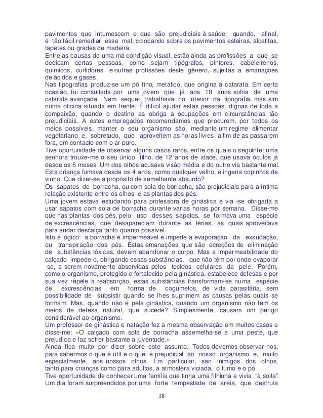 18. 18. 18 pavimentos que intumescem e que são prejudiciais à saúde, quando, afinal, é tão fácil remediar esse mal, colocando sobre os pavimentos esteiras, alcatifas, tapetes ou grades de madeira. Entre as causas de uma má condição visual, estão ainda as profissões a que se dedicam certas pessoas, como sejam tipógrafos, pintores, cabeleireiros, químicos, curtidores e outras profissões deste gênero, sujeitas a emanações de ácidos e gases. Nas tipografias produz-se um pó fino, metálico, que origina a catarata. Em certa ocasião, fui consultada por uma jovem que já aos 18 anos sofria de uma catarata avançada. Nem sequer trabalhava no interior da tipografia, mas sim numa oficina situada em frente. É difícil ajudar estas pessoas, dignas de toda a compaixão, quando o destino as obriga a ocupações em circunstâncias tão prejudiciais. A estes empregados recomendamos que procurem, por todos os meios possíveis, manter o seu organismo são, mediante um regime alimentar vegetariano e, sobretudo, que aproveitem as horas livres, a fim de as passarem fora, em contacto com o ar puro. Tive oportunidade de observar alguns casos raros, entre os quais o seguinte: uma senhora trouxe-me o seu único filho, de 12 anos de idade, que usava óculos já desde os 6 meses. Um dos olhos acusava visão média e do outro via bastante mal. Esta criança fumava desde os 4 anos, como qualquer velho, e ingeria copinhos de vinho. Que dizer-se a propósito de semelhante absurdo? Os sapatos de borracha, ou com sola de borracha, são prejudiciais para a íntima relação existente entre os olhos e as plantas dos pés. Uma jovem estava estudando para professora de ginástica e via -se obrigada a usar sapatos com sola de borracha durante várias horas por semana. Disse-me que nas plantas dos pés, pelo uso desses sapatos, se formava uma espécie de excrescências, que desapareciam durante as férias, as quais aproveitava para andar descalça tanto quanto possível. Isto é lógico: a borracha é impermeável e impede a evaporação da exsudação, ou transpiração dos pés. Estas emanações, que são ecreções de eliminação de substâncias tóxicas, devem abandonar o corpo. Mas a impermeabilidade do calçado impede-o, obrigando essas substâncias, que não têm por onde evaporar -se, a serem novamente absorvidas pelos tecidos celulares da pele. Porém, como o organismo, protegido e fortalecido pela ginástica, estabelece defesas e por sua vez repele a reabsorção, estas substâncias transformam-se numa espécie de excrescências em forma de cogumelos, de vida parasitária, sem possibilidade de subsistir quando se lhes suprimem as causas pelas quais se formam. Mas, quando não é pela ginástica, quando um organismo não tem os meios de defesa natural, que sucede? Simplesmente, causam um perigo considerável ao organismo. Um professor de ginástica e natação fez a mesma observação em muitos casos e disse-me: «O calçado com sola de borracha assemelha-se a uma peste, que prejudica e faz sofrer bastante a juventude.» Ainda fica muito por dizer sobre este assunto. Todos devemos observar-nos, para sabermos o que é útil e o que é prejudicial ao nosso organismo e, muito especialmente, aos nossos olhos. Em particular, são inimigos dos olhos, tanto para crianças como para adultos, a atmosfera viciada, o fumo e o pó. Tive oportunidade de conhecer uma família que tinha uma filhinha e vivia “à solta”. Um dia foram surpreendidos por uma forte tempestade de areia, que destruía