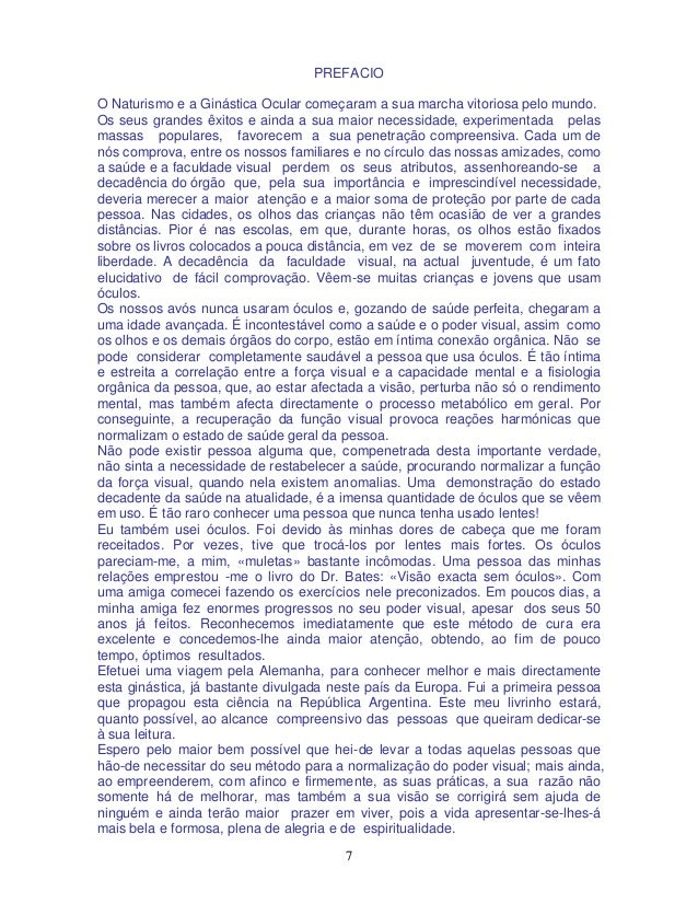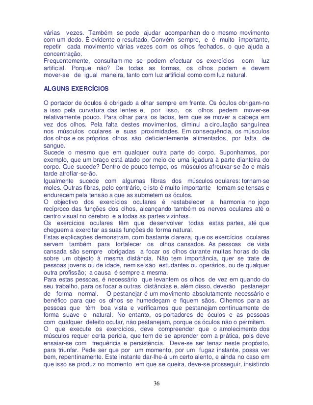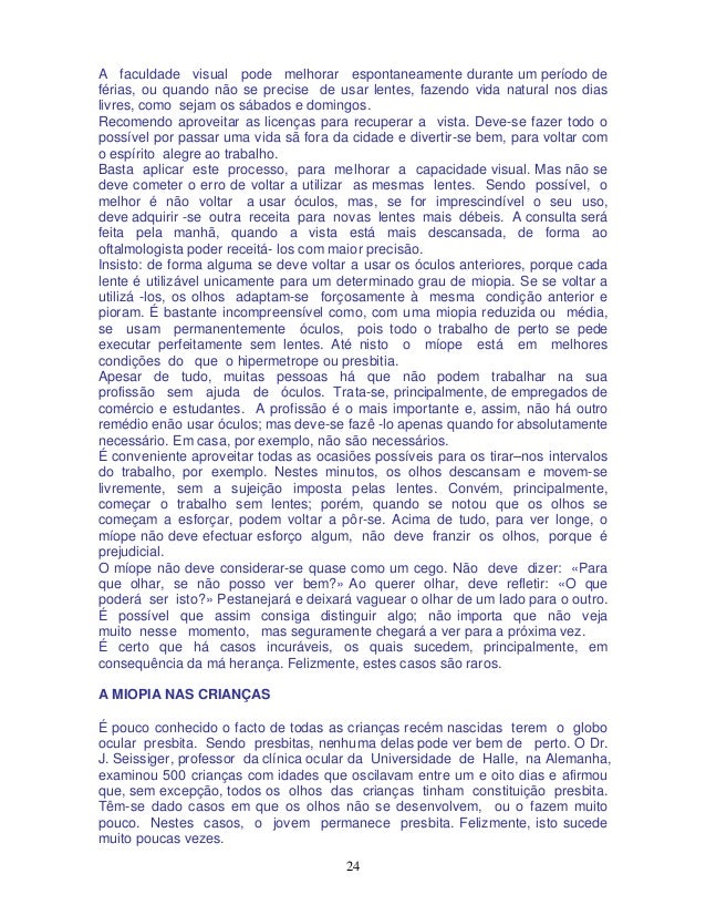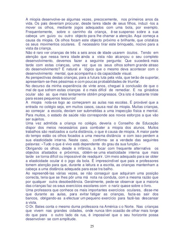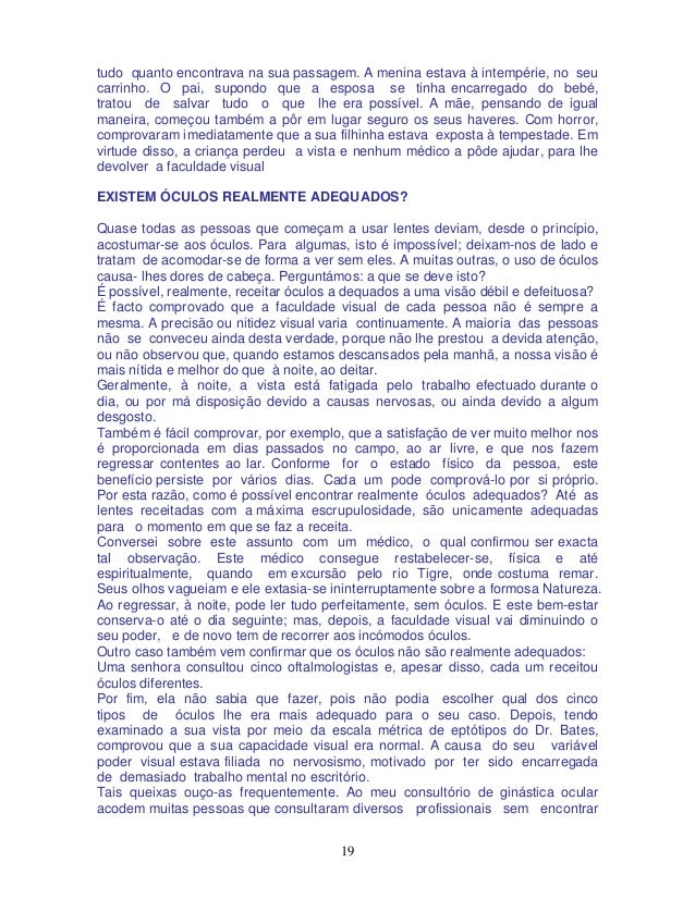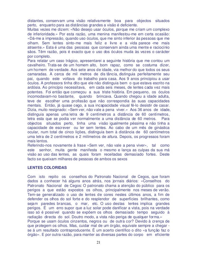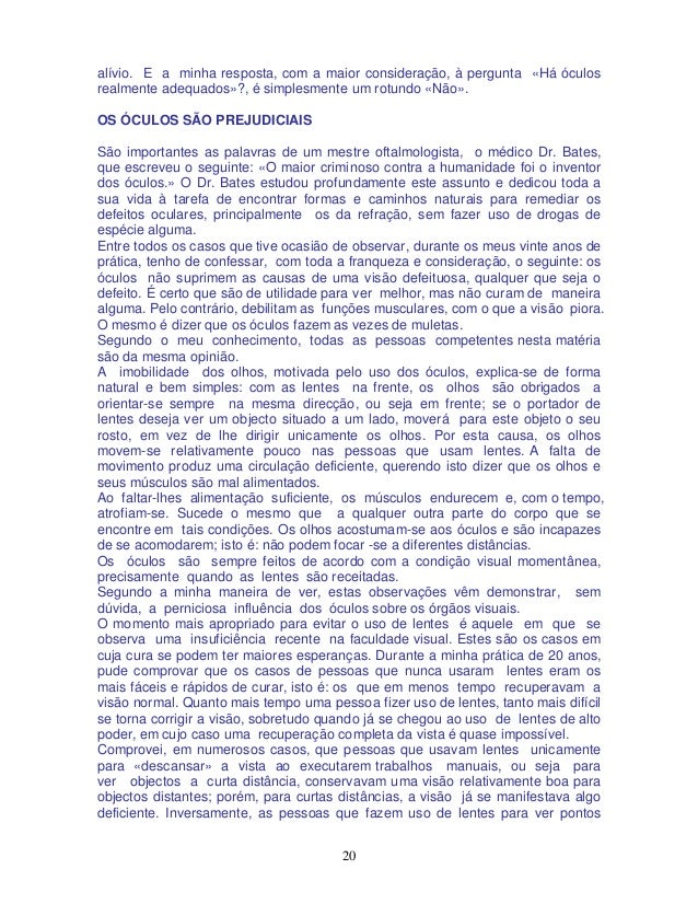 20. 20. 20 alívio. E a minha resposta, com a maior consideração, à pergunta «Há óculos realmente adequados»?, é simplesmente um rotundo «Não». OS ÓCULOS SÃO PREJUDICIAIS São importantes as palavras de um mestre oftalmologista, o médico Dr. Bates, que escreveu o seguinte: «O maior criminoso contra a humanidade foi o inventor dos óculos.» O Dr. Bates estudou profundamente este assunto e dedicou toda a sua vida à tarefa de encontrar formas e caminhos naturais para remediar os defeitos oculares, principalmente os da refração, sem fazer uso de drogas de espécie alguma. Entre todos os casos que tive ocasião de observar, durante os meus vinte anos de prática, tenho de confessar, com toda a franqueza e consideração, o seguinte: os óculos não suprimem as causas de uma visão defeituosa, qualquer que seja o defeito. É certo que são de utilidade para ver melhor, mas não curam de maneira alguma. Pelo contrário, debilitam as funções musculares, com o que a visão piora. O mesmo é dizer que os óculos fazem as vezes de muletas. Segundo o meu conhecimento, todas as pessoas competentes nesta matéria são da mesma opinião. A imobilidade dos olhos, motivada pelo uso dos óculos, explica-se de forma natural e bem simples: com as lentes na frente, os olhos são obrigados a orientar-se sempre na mesma direcção, ou seja em frente; se o portador de lentes deseja ver um objecto situado a um lado, moverá para este objeto o seu rosto, em vez de lhe dirigir unicamente os olhos. Por esta causa, os olhos movem-se relativamente pouco nas pessoas que usam lentes. A falta de movimento produz uma circulação deficiente, querendo isto dizer que os olhos e seus músculos são mal alimentados. Ao faltar-lhes alimentação suficiente, os músculos endurecem e, com o tempo, atrofiam-se. Sucede o mesmo que a qualquer outra parte do corpo que se encontre em tais condições. Os olhos acostumam-se aos óculos e são incapazes de se acomodarem; isto é: não podem focar -se a diferentes distâncias. Os óculos são sempre feitos de acordo com a condição visual momentânea, precisamente quando as lentes são receitadas. Segundo a minha maneira de ver, estas observações vêm demonstrar, sem dúvida, a perniciosa influência dos óculos sobre os órgãos visuais. O momento mais apropriado para evitar o uso de lentes é aquele em que se observa uma insuficiência recente na faculdade visual. Estes são os casos em cuja cura se podem ter maiores esperanças. Durante a minha prática de 20 anos, pude comprovar que os casos de pessoas que nunca usaram lentes eram os mais fáceis e rápidos de curar, isto é: os que em menos tempo recuperavam a visão normal. Quanto mais tempo uma pessoa fizer uso de lentes, tanto mais difícil se torna corrigir a visão, sobretudo quando já se chegou ao uso de lentes de alto poder, em cujo caso uma recuperação completa da vista é quase impossível. Comprovei, em numerosos casos, que pessoas que usavam lentes unicamente para «descansar» a vista ao executarem trabalhos manuais, ou seja para ver objectos a curta distância, conservavam uma visão relativamente boa para objectos distantes; porém, para curtas distâncias, a visão já se manifestava algo deficiente. Inversamente, as pessoas que fazem uso de lentes para ver pontos