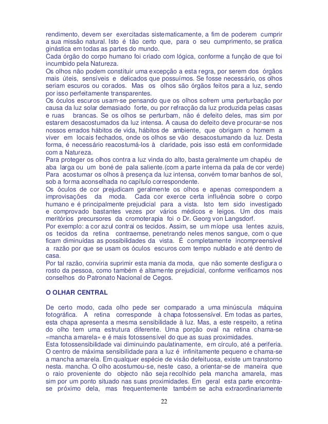 14. 14. 14 Além disso, cada qual, segundo as circunstâncias, inventa outros exercícios apropriados para cada caso particular. Na Alemanha, o método sofreu grande ampliação devido à cooperação prestada pelas medicinas Naturista e Homeopática. Os institutos reconhecem as possibilidades de aumentar ainda mais o êxito com a particularidade de conhecer melhor a natureza e a personalidade das pessoas afectadas. Em certas partes da índia, o método do Dr. Bates é altamente apreciado. Na estatística anual do Instituto de Oftalmologia de Bulantshas, uma cidade na região do rio Ganges, fazem-se notar os bons resultados que se obtiveram com os ensaios levados a efeito no ano de 1930, ao curar os transtornos visuais sem óculos. Mediante alguns exercícios oculares, muito simples, cura-se a visão deficiente. Por esta razão, nas escolas e institutos de ensino superior da índia, fizeram-se ensaios de profilaxia para curar a visão defeituosa na geração que se está educando, por meio da distribuição de folhetos ensinando a obter uma visão perfeita sem óculos. Foram examinados os olhos de cerca de 1000 alunos de forma muito simples. A maioria destes alunos, de visão deficiente, foram curados por meio destes exercícios. O médico Director, Dr. Ragbubir Saraw Agarwal, informa, numa revista de 1932, sobre as medidas tomadas nas escolas contra a miopia, o seguinte: «Este método preventivo da miopia tem sido aplicado em todas as universidades deste distrito; sem o uso de óculos, pude curar muitos es tudantes da sua visão deficiente!». No ano de 1931, o citado hospital oftalmológico tratou por este processo o número considerável de 7166 doentes. É de desejar que outros países reconheçam também o alto valor da ginástica ocular para a visão e a adotem para a aplicar nas escolas e colégios. Isso não somente seria de utilidade para cada um dos habitantes, mas também o próprio Estado seria amplamente beneficiado com esta medida, pois salta à vista e à compreensão individual que quanto mais perfeita e maior for a capacidade de rendimento mental de um povo, tanto mais forte será o Estado. CAUSAS DE UMA VISÃO DEFEITUOSA Quase todos os portadores de óculos perguntam, como é muito natural: «Porque vejo tão mal? Na minha família ninguém usa óculos, excepto eu.» As causas da má faculdade visual obedecem a diversas espécies e a muitos fatores. Tal como nas pessoas existem diversos estados de saúde, assim também existem diversas capacidades de visualidade. E, por isso, é fácil determinar que a saúde e o poder visual estão intimamente relacionados entre si. Pode-se determinar o estado de saúde duma pessoa, ou a natureza da doença que afecta um organismo, pela receptividade que possa revelar a certas influências externas. Por conseguinte, o estado de saúde ou de doença de um organismo depende da maneira como atua a receptividade orgânica ante certas influências. A parte mais débil dum corpo será sempre a mais receptiva às influências desfavoráveis do meio ambiente. Isto manifesta-se em muitas crianças quando começam a frequentar a escola. É contra a natureza infantil o estar, quieto e sentado durante várias horas. As crianças desejam mover-se e brincar com inteira liberdade. Também a força mental é coisa nova.