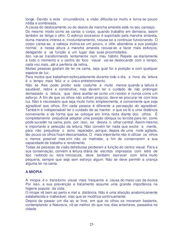 23. 23. 23 longe. Devido a esta circunstância, a visão dificulta-se muito e torna-se pouco nítida e sombreada. A causa do deslocamento ou do desvio da mancha amarela está no seu cansaço. Do mesmo modo como se cansa o corpo, quando trabalha em demasia, assim também se fatiga o olho. O esforço excessivo é suportado pela mancha amarela, duma maneira intensa e, involuntariamente, recusa-se a continuar funcionando. O corpo cansa-se, a cabeça inclina-se um pouco, o olho abandona a sua posição normal e nessa altura a mancha amarela recusa-se a fazer mais esforços, delegando a ua função a um lugar das suas proximidades. Isto vai-se transformando lentamente num mau hábito. Repete -se diariamente a todo o momento e o centro do foco visual vai-se deslocando com o tempo, cada vez mais, até a periferia da retina. Muitas pessoas gostam de ler na cama, seja qual for a posição e com qualquer espécie de luz. Para muitos que trabalham esforçadamente durante todo o dia, a hora da leitura é o tempo mais feliz e o único entretenimento. Não se lhes pode proibir este costume e muito menos quando a leitura é saudável, nobre e construtiva; mas devem ter o cuidado de não prolongar demasiado a leitura, que deve aceitar-se como um recreio e nunca como um esforço. A fim de que os olhos não sofram prejuízo, deve-se procurar ler com boa luz. Não é necessário que seja muito forte; simplesmente, é conveniente que seja agradável aos olhos. Em cada pessoa é diferente a percepção do agradável. Também é indispensável ter o cuidado de se manter o que se lê a uma distância conveniente e de forma que se coloque em linha recta diante dos olhos. É completamente prejudicial adoptar uma posição oblíqua ou torcida para ler, como pode suceder na cama, pois, por isso, se desvia o olhar central. Assim mesmo, é importante a selecção da leitura. Não convém ler nada que excite a mente, para não prejudicar o sono reparador, porque, depois de uma noite agitada, tão pouco os olhos ficam descansados. O mais importante não é utilizar os olhos o menos possível mas sim não os maltratar, a fim de conservarem a sua capacidade de trabalho e rendimento. Todas as pessoas de visão defeituosa perderam a função do centro visual. Para a sua conservação, convém a leitura diária de escritos impressos com letra de tipo redondo ou letra minúscula, deve também escrever com letra muito pequena, sempre que seja sem esforço algum. Não se deve permitir a criança alguma ler na cama. A MIOPIA A miopia é o transtorno visual mais frequente e causa do maior uso de óculos. Por isso, a sua prevenção e tratamento assume uma grande importância na higiene popular da vista. O míope vê bem ao perto e mal a distância. Não é uma afecção anatomicamente estabelecida e inalterável, mas que se modifica continuamente. Depois de passar um dia ao ar livre, em que os olhos se moveram bastante, contemplando a Natureza, vê-se melhor do que nos dias anteriores, passados na cidade.