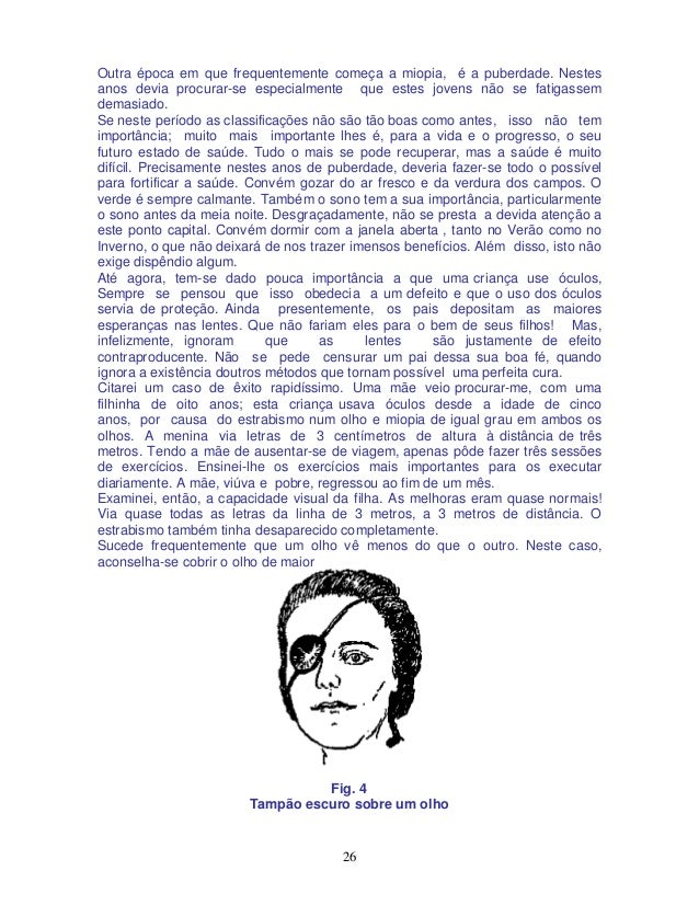 26. 26. 26 Outra época em que frequentemente começa a miopia, é a puberdade. Nestes anos devia procurar-se especialmente que estes jovens não se fatigassem demasiado. Se neste período as classificações não são tão boas como antes, isso não tem importância; muito mais importante lhes é, para a vida e o progresso, o seu futuro estado de saúde. Tudo o mais se pode recuperar, mas a saúde é muito difícil. Precisamente nestes anos de puberdade, deveria fazer-se todo o possível para fortificar a saúde. Convém gozar do ar fresco e da verdura dos campos. O verde é sempre calmante. Também o sono tem a sua importância, particularmente o sono antes da meia noite. Desgraçadamente, não se presta a devida atenção a este ponto capital. Convém dormir com a janela aberta , tanto no Verão como no Inverno, o que não deixará de nos trazer imensos benefícios. Além disso, isto não exige dispêndio algum. Até agora, tem-se dado pouca importância a que uma criança use óculos, Sempre se pensou que isso obedecia a um defeito e que o uso dos óculos servia de proteção. Ainda presentemente, os pais depositam as maiores esperanças nas lentes. Que não fariam eles para o bem de seus filhos! Mas, infelizmente, ignoram que as lentes são justamente de efeito contraproducente. Não se pede censurar um pai dessa sua boa fé, quando ignora a existência doutros métodos que tornam possível uma perfeita cura. Citarei um caso de êxito rapidíssimo. Uma mãe veio procurar-me, com uma filhinha de oito anos; esta criança usava óculos desde a idade de cinco anos, por causa do estrabismo num olho e miopia de igual grau em ambos os olhos. A menina via letras de 3 centímetros de altura à distância de três metros. Tendo a mãe de ausentar-se de viagem, apenas pôde fazer três sessões de exercícios. Ensinei-lhe os exercícios mais importantes para os executar diariamente. A mãe, viúva e pobre, regressou ao fim de um mês. Examinei, então, a capacidade visual da filha. As melhoras eram quase normais! Via quase todas as letras da linha de 3 metros, a 3 metros de distância. O estrabismo também tinha desaparecido completamente. Sucede frequentemente que um olho vê menos do que o outro. Neste caso, aconselha-se cobrir o olho de maior Fig. 4 Tampão escuro sobre um olho