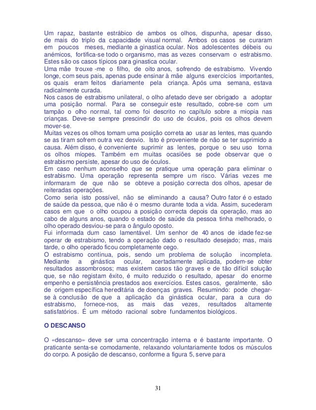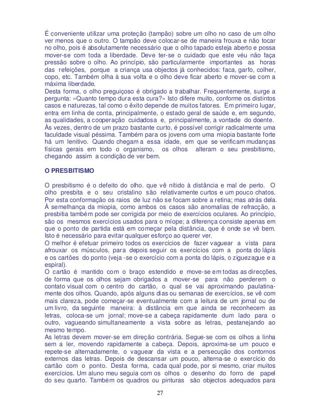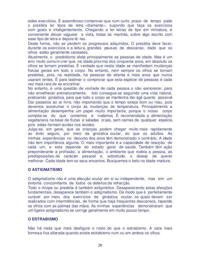 28. 28. 28 estes exercícios. É assombroso comprovar que num curto prazo de tempo pode o presbita ler tipos de letra «diamante», supondo que faça os exercícios com gosto e inteligentemente. Chegando a ler letras de tipo em miniatura, é conveniente deixar vaguear a vista, todas as manhãs, sobre algo escrito com esse tipo de letra e depois lê -las. Desta forma, não se perdem os progressos adquiridos. O presbita deve fazer, durante os exercícios e a leitura, grandes pausas de descanso, dado que os olhos estão geralmente cansados. Atualmente, o presbitismo afeta principalmente as pessoas de idade. Mas é um erro muito comum crer que, na idade próxima dos cinquenta anos, em absoluto os olhos se tornem presbitas. É verdade que nesta idade se manifestam mudanças físicas gerais em todo o corpo. No entanto, nem sempre os olhos se tornam presbitas, pois, na realidade, há pessoas de oitenta e mais anos que nunca usaram lentes. É para lastimar o comprovar que esta espécie de pessoas é cada vez mais rara de se encontrar. No entanto, é uma questão de vontade de cada pessoa o não esmorecer, para não envelhecer prematuramente. Isto consegue-se seguindo uma vida natural, praticando ginástica, para que todo o corpo se mantenha tão ágil quanto possível. Dar passeios ao ar livre, não importando que o tempo esteja bom ou mau, pois devemos acostumar o corpo às mudanças de temperatura. Principalmente a alimentação desempenha um papel muito importante, porque o nosso corpo compõe-se do que comemos e inalamos. É recomendada a alimentação vegetariana na base de frutas e saladas cruas, sem carnes de qualquer espécie, pois estas formam acidez nos tecidos. Julga-se, em geral, que as crianças podem chegar muito mais rapidamente ao êxito seguro, por meio da ginástica ocular, do que os adultos. As minhas experiências no decurso dos anos têm demonstrado o contrário. A idade não tem importância alguma. O mais importante é a capacidade de reacção de cada um, e esta depende do estado geral de saúde. Também têm ação preponderante a profissão, a alimentação, o ambiente que rodeia a pessoa, as predisposições de carácter pessoal e, sobretudo, o desejo de querer melhorar. Cada idade tem os seus encantos. Busquemos o belo na idade madura. O ASTIGMATISMO O astigmatismo não é uma afecção ocular em si ou independente, mas sim um sintoma concomitante de todos os defeitos da refracção. Todo o míope ou presbita é também astigmático. Desaparecendo estas afecções fundamentais, desaparece também o astigmatismo. De modo que é perfeitamente curável por meio dos exercícios de ginástica ocular, os quais devem ser realizados com intermitências, de forma que haja frequentes descansos, tapando os olhos com as palmas das mãos. As minhas experiências demonstraram que um ligeiro astigmatismo se corrige geralmente em muito pouco tempo. O ESTRABISMO Não há nada que mais desfigure o rosto do que o estrabismo. A cara mais formosa fica alterada quando existe estrabismo num ou em ambos os olhos.