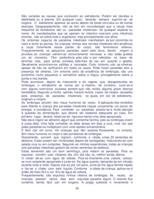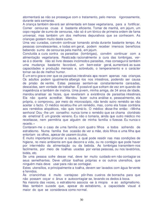 30. 30. 30 atormentará se não se prossegue com o tratamento, pelo menos rigorosamente, durante seis semanas. A criança também deverá ser alimentada em base vegetariana, para a fortificar. Comer cenouras cruas é bastante eficiente. Tomar de manhã, em jejum, um copo regular de sumo de cenouras, não só é um tónico de primeira ordem de fama universal, mas também um dos melhores depurativos que se conhecem. As crianças gostam muito deste sumo. Uma vez curadas, convém continuar tomando ainda durante bastante tempo. As pessoas convalescentes, e todas em geral, podem receber imensos benefícios bebendo sumo de cenouras pela manhã, em jejum. Concluída a cura contra os parasitas (lombrigas), convêm continuar com a alimentação vegetariana. Realizada racionalmente a cura das lombrigas, ver- se-á o doente não só livre desses incómodos parasitas, mas conseguirá também uma mudança bastante favorável, um bem-estar geral, aumentará as suas capacidades e produção mensais e, sobretudo, o temperamento e o carácter tornar-se-ão de melhor humor. É um erro grave crer que os parasitas intestinais apa recem apenas nas crianças. Os adultos podem igualmente albergá -los nos intestinos, podendo ser causa de prisão de ventre. Estas pessoas sentem-se constantemente cansadas, descaídas, sem vontade de trabalhar. É possível que sofram de vez em quando de inapetência e também de insónia. Uma jovem, minha amiga, de 34 anos de idade, mandou analisar as fezes, que revelaram a existência de parasitas intestinais. Ela não queria acreditar. Mandou fazer outra análise e, pessoalmente, ela própria, o comprovou, por meio do microscópio, não tendo outro remédio se não aceitar o facto. O médico receitou-lhe um remédio, mas, como ela fosse contrária aos remédios alopáticos, não quis tomá-lo. O médico disse-lhe então: «Minha senhora! Dou -lhe um conselho: nunca tome o remédio que se chama cloridrato de emetina! É um grande veneno. Eu não o tomaria, ainda que outro médico mo receitasse, nem permitiria que alguém de minha família o fizesse. Eu nunca o receito.» Contaram-me o caso de uma família com quatro filhos e todos sofrendo de estrabismo. Numa família tive ocasião de ver a mãe, dois filhos e uma filha que entortam os olhos, apesar de usarem óculos. É muito importante procurar a causa, a qual pode residir nas mas condições de higiene, no meio ambiente em que decorre a vida, ou no contágio que pode haver por intermédio da alimentação ou da bebida. As lombrigas transmitem-nos facilmente, por meio de toalhas usadas por varias pessoas, ou nos lavatórios, bidés, etc. Se uma pessoa sofre desse mal, deve ter muito cuidado em não contagiar os seus semelhantes. Deve utilizar toalhas próprias e os outros utensílios, que ninguém mais deve usar para não se contagiar. Estes utensílios, e principalmente a toalha, devem ser lavados com água fervente e fervidos. Às criancinhas é muito vantajoso pôr-lhes cueiros de borracha para que não possam coçar o ânus e autocontagiar-se, levando os dedos à boca. Na maioria das vezes, o estrabismo associa -se à miopia e ao astigmatismo. Mas também sucede que, apesar do estrabismo, a capacidade visual é maior do que se considerava como normal.