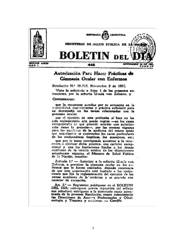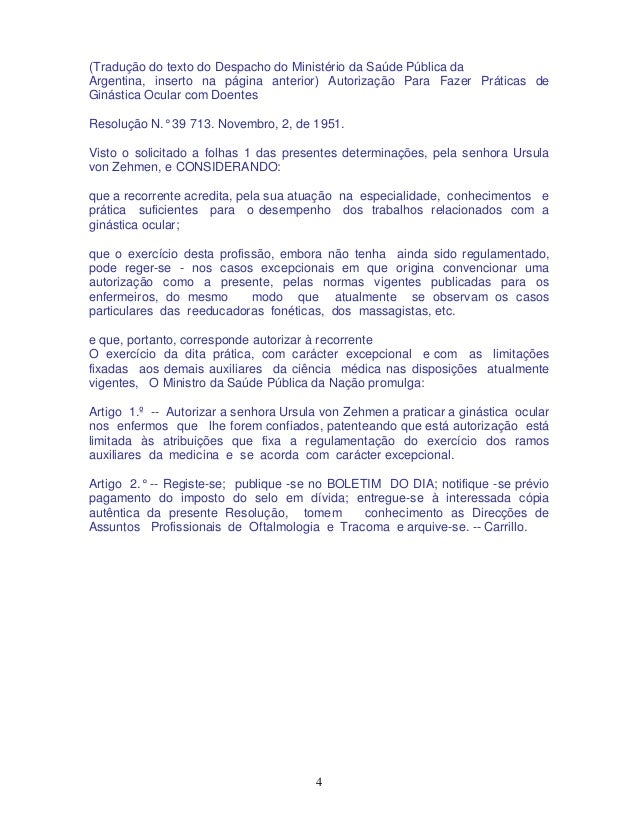 4. 4. 4 (Tradução do texto do Despacho do Ministério da Saúde Pública da Argentina, inserto na página anterior) Autorização Para Fazer Práticas de Ginástica Ocular com Doentes Resolução N.° 39 713. Novembro, 2, de 1951. Visto o solicitado a folhas 1 das presentes determinações, pela senhora Ursula von Zehmen, e CONSIDERANDO: que a recorrente acredita, pela sua atuação na especialidade, conhecimentos e prática suficientes para o desempenho dos trabalhos relacionados com a ginástica ocular; que o exercício desta profissão, embora não tenha ainda sido regulamentado, pode reger-se - nos casos excepcionais em que origina convencionar uma autorização como a presente, pelas normas vigentes publicadas para os enfermeiros, do mesmo modo que atualmente se observam os casos particulares das reeducadoras fonéticas, dos massagistas, etc. e que, portanto, corresponde autorizar à recorrente O exercício da dita prática, com carácter excepcional e com as limitações fixadas aos demais auxiliares da ciência médica nas disposições atualmente vigentes, O Ministro da Saúde Pública da Nação promulga: Artigo 1.º -- Autorizar a senhora Ursula von Zehmen a praticar a ginástica ocular nos enfermos que lhe forem confiados, patenteando que está autorização está limitada às atribuições que fixa a regulamentação do exercício dos ramos auxiliares da medicina e se acorda com carácter excepcional. Artigo 2.° -- Registe-se; publique -se no BOLETIM DO DIA; notifique -se prévio pagamento do imposto do selo em dívida; entregue-se à interessada cópia autêntica da presente Resolução, tomem conhecimento as Direcções de Assuntos Profissionais de Oftalmologia e Tracoma e arquive-se. -- Carrillo.