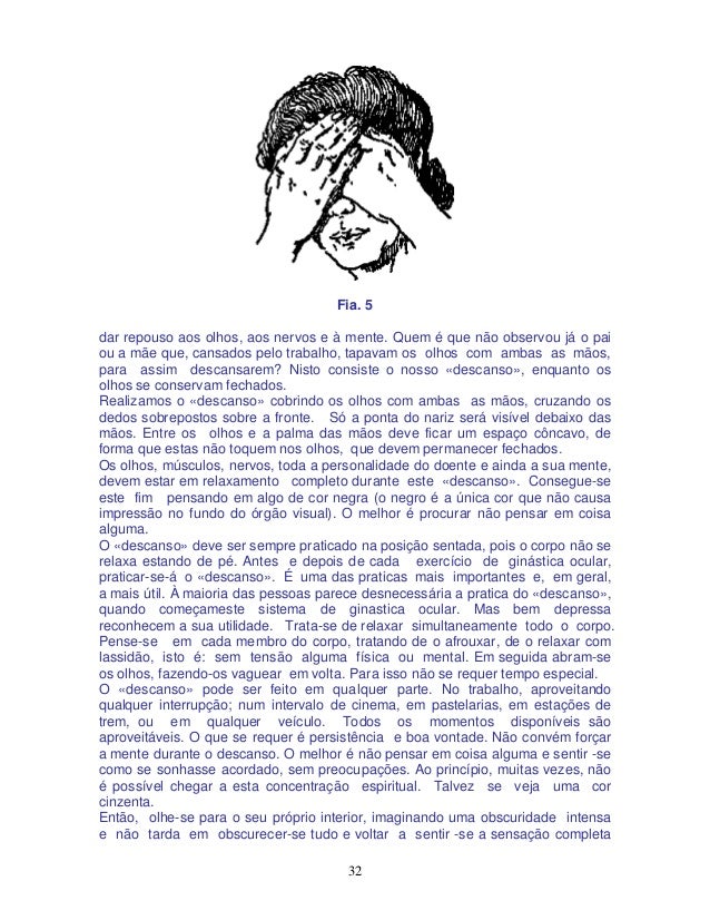 32. 32. 32 Fia. 5 dar repouso aos olhos, aos nervos e à mente. Quem é que não observou já o pai ou a mãe que, cansados pelo trabalho, tapavam os olhos com ambas as mãos, para assim descansarem? Nisto consiste o nosso «descanso», enquanto os olhos se conservam fechados. Realizamos o «descanso» cobrindo os olhos com ambas as mãos, cruzando os dedos sobrepostos sobre a fronte. Só a ponta do nariz será visível debaixo das mãos. Entre os olhos e a palma das mãos deve ficar um espaço côncavo, de forma que estas não toquem nos olhos, que devem permanecer fechados. Os olhos, músculos, nervos, toda a personalidade do doente e ainda a sua mente, devem estar em relaxamento completo durante este «descanso». Consegue-se este fim pensando em algo de cor negra (o negro é a única cor que não causa impressão no fundo do órgão visual). O melhor é procurar não pensar em coisa alguma. O «descanso» deve ser sempre praticado na posição sentada, pois o corpo não se relaxa estando de pé. Antes e depois de cada exercício de ginástica ocular, praticar-se-á o «descanso». É uma das praticas mais importantes e, em geral, a mais útil. À maioria das pessoas parece desnecessária a pratica do «descanso», quando começameste sistema de ginastica ocular. Mas bem depressa reconhecem a sua utilidade. Trata-se de relaxar simultaneamente todo o corpo. Pense-se em cada membro do corpo, tratando de o afrouxar, de o relaxar com lassidão, isto é: sem tensão alguma física ou mental. Em seguida abram-se os olhos, fazendo-os vaguear em volta. Para isso não se requer tempo especial. O «descanso» pode ser feito em qualquer parte. No trabalho, aproveitando qualquer interrupção; num intervalo de cinema, em pastelarias, em estações de trem, ou em qualquer veículo. Todos os momentos disponíveis são aproveitáveis. O que se requer é persistência e boa vontade. Não convém forçar a mente durante o descanso. O melhor é não pensar em coisa alguma e sentir -se como se sonhasse acordado, sem preocupações. Ao princípio, muitas vezes, não é possível chegar a esta concentração espiritual. Talvez se veja uma cor cinzenta. Então, olhe-se para o seu próprio interior, imaginando uma obscuridade intensa e não tarda em obscurecer-se tudo e voltar a sentir -se a sensação completa