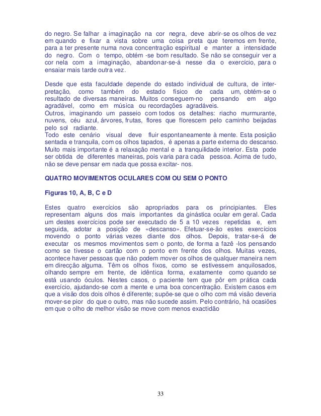 33. 33. 33 do negro. Se falhar a imaginação na cor negra, deve abrir-se os olhos de vez em quando e fixar a vista sobre uma coisa preta que teremos em frente, para a ter presente numa nova concentração espiritual e manter a intensidade do negro. Com o tempo, obtém -se bom resultado. Se não se conseguir ver a cor nela com a imaginação, abandonar-se-á nesse dia o exercício, para o ensaiar mais tarde outra vez. Desde que esta faculdade depende do estado individual de cultura, de inter- pretação, como também do estado físico de cada um, obtém-se o resultado de diversas maneiras. Muitos conseguem-no pensando em algo agradável, como em música ou recordações agradáveis. Outros, imaginando um passeio com todos os detalhes: riacho murmurante, nuvens, céu azul, árvores, frutas, flores que florescem pelo caminho beijadas pelo sol radiante. Todo este cenário visual deve fluir espontaneamente à mente. Esta posição sentada e tranquila, com os olhos tapados, é apenas a parte externa do descanso. Muito mais importante é a relaxação mental e a tranquilidade interior. Esta pode ser obtida de diferentes maneiras, pois varia para cada pessoa. Acima de tudo, não se deve pensar em nada que possa excitar- nos. QUATRO MOVIMENTOS OCULARES COM OU SEM O PONTO Figuras 10, A, B, C e D Estes quatro exercícios são apropriados para os principiantes. Eles representam alguns dos mais importantes da ginástica ocular em geral. Cada um destes exercícios pode ser executado de 5 a 10 vezes repetidas e, em seguida, adotar a posição de «descanso». Efetuar-se-ão estes exercícios movendo o ponto várias vezes diante dos olhos. Depois, tratar-se-á de executar os mesmos movimentos sem o ponto, de forma a fazê -los pensando como se tivesse o cartão com o ponto em frente dos olhos. Muitas vezes, acontece haver pessoas que não podem mover os olhos de qualquer maneira nem em direcção alguma. Têm os olhos fixos, como se estivessem anquilosados, olhando sempre em frente, de idêntica forma, exatamente como quando se está usando óculos. Nestes casos, o paciente tem que pôr em prática cada exercício, ajudando-se com a mente e uma boa concentração. Existem casos em que a visão dos dois olhos é diferente; supõe-se que o olho com má visão deveria mover-se pior do que o outro, mas não sucede assim. Pelo contrário, há ocasiões em que o olho de melhor visão se move com menos exactidão