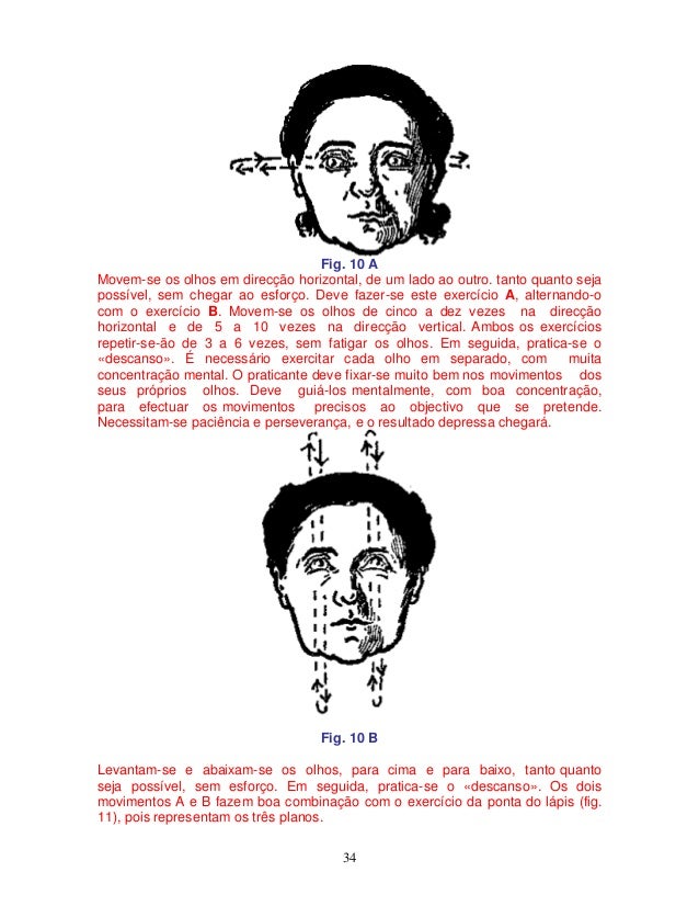 34. 34. 34 Fig. 10 A Movem-se os olhos em direcção horizontal, de um lado ao outro. tanto quanto seja possível, sem chegar ao esforço. Deve fazer-se este exercício A, alternando-o com o exercício B. Movem-se os olhos de cinco a dez vezes na direcção horizontal e de 5 a 10 vezes na direcção vertical. Ambos os exercícios repetir-se-ão de 3 a 6 vezes, sem fatigar os olhos. Em seguida, pratica-se o «descanso». É necessário exercitar cada olho em separado, com muita concentração mental. O praticante deve fixar-se muito bem nos movimentos dos seus próprios olhos. Deve guiá-los mentalmente, com boa concentração, para efectuar os movimentos precisos ao objectivo que se pretende. Necessitam-se paciência e perseverança, e o resultado depressa chegará. Fig. 10 B Levantam-se e abaixam-se os olhos, para cima e para baixo, tanto quanto seja possível, sem esforço. Em seguida, pratica-se o «descanso». Os dois movimentos A e B fazem boa combinação com o exercício da ponta do lápis (fig. 11), pois representam os três planos.