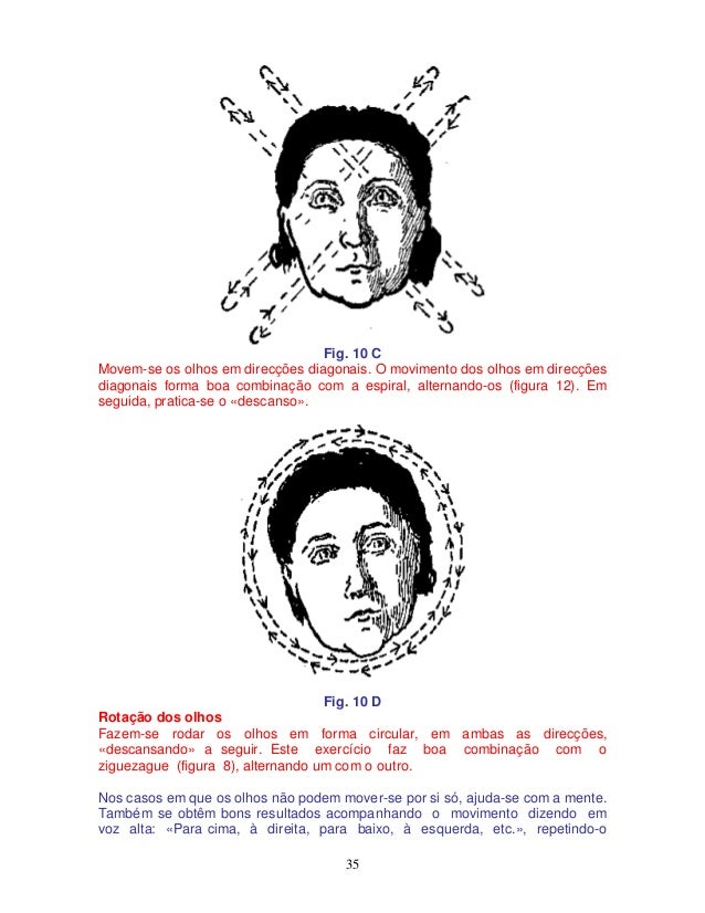 35. 35. 35 Fig. 10 C Movem-se os olhos em direcções diagonais. O movimento dos olhos em direcções diagonais forma boa combinação com a espiral, alternando-os (figura 12). Em seguida, pratica-se o «descanso». Fig. 10 D Rotação dos olhos Fazem-se rodar os olhos em forma circular, em ambas as direcções, «descansando» a seguir. Este exercício faz boa combinação com o ziguezague (figura 8), alternando um com o outro. Nos casos em que os olhos não podem mover-se por si só, ajuda-se com a mente. Também se obtêm bons resultados acompanhando o movimento dizendo em voz alta: «Para cima, à direita, para baixo, à esquerda, etc.», repetindo-o