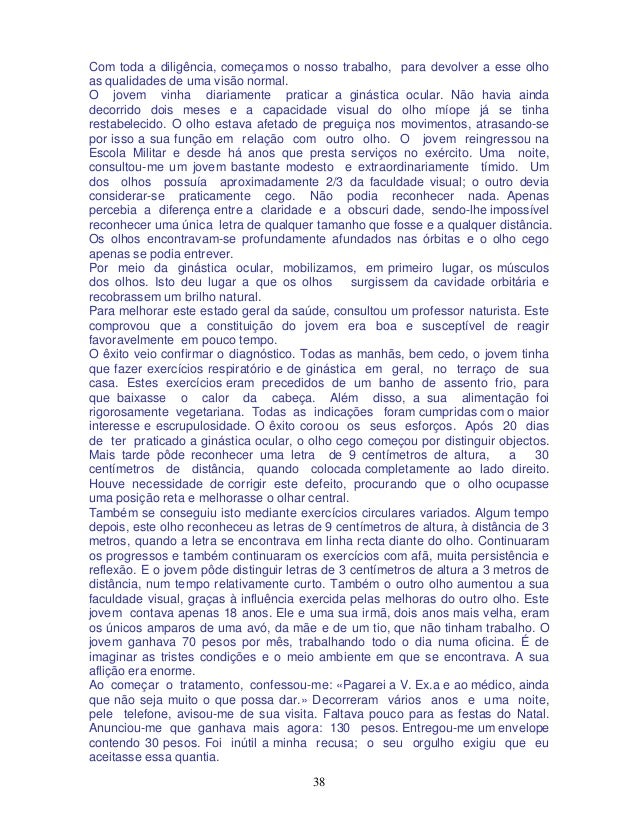 38. 38. 38 Com toda a diligência, começamos o nosso trabalho, para devolver a esse olho as qualidades de uma visão normal. O jovem vinha diariamente praticar a ginástica ocular. Não havia ainda decorrido dois meses e a capacidade visual do olho míope já se tinha restabelecido. O olho estava afetado de preguiça nos movimentos, atrasando-se por isso a sua função em relação com outro olho. O jovem reingressou na Escola Militar e desde há anos que presta serviços no exército. Uma noite, consultou-me um jovem bastante modesto e extraordinariamente tímido. Um dos olhos possuía aproximadamente 2/3 da faculdade visual; o outro devia considerar-se praticamente cego. Não podia reconhecer nada. Apenas percebia a diferença entre a claridade e a obscuri dade, sendo-lhe impossível reconhecer uma única letra de qualquer tamanho que fosse e a qualquer distância. Os olhos encontravam-se profundamente afundados nas órbitas e o olho cego apenas se podia entrever. Por meio da ginástica ocular, mobilizamos, em primeiro lugar, os músculos dos olhos. Isto deu lugar a que os olhos surgissem da cavidade orbitária e recobrassem um brilho natural. Para melhorar este estado geral da saúde, consultou um professor naturista. Este comprovou que a constituição do jovem era boa e susceptível de reagir favoravelmente em pouco tempo. O êxito veio confirmar o diagnóstico. Todas as manhãs, bem cedo, o jovem tinha que fazer exercícios respiratório e de ginástica em geral, no terraço de sua casa. Estes exercícios eram precedidos de um banho de assento frio, para que baixasse o calor da cabeça. Além disso, a sua alimentação foi rigorosamente vegetariana. Todas as indicações foram cumpridas com o maior interesse e escrupulosidade. O êxito coroou os seus esforços. Após 20 dias de ter praticado a ginástica ocular, o olho cego começou por distinguir objectos. Mais tarde pôde reconhecer uma letra de 9 centímetros de altura, a 30 centímetros de distância, quando colocada completamente ao lado direito. Houve necessidade de corrigir este defeito, procurando que o olho ocupasse uma posição reta e melhorasse o olhar central. Também se conseguiu isto mediante exercícios circulares variados. Algum tempo depois, este olho reconheceu as letras de 9 centímetros de altura, à distância de 3 metros, quando a letra se encontrava em linha recta diante do olho. Continuaram os progressos e também continuaram os exercícios com afã, muita persistência e reflexão. E o jovem pôde distinguir letras de 3 centímetros de altura a 3 metros de distância, num tempo relativamente curto. Também o outro olho aumentou a sua faculdade visual, graças à influência exercida pelas melhoras do outro olho. Este jovem contava apenas 18 anos. Ele e uma sua irmã, dois anos mais velha, eram os únicos amparos de uma avó, da mãe e de um tio, que não tinham trabalho. O jovem ganhava 70 pesos por mês, trabalhando todo o dia numa oficina. É de imaginar as tristes condições e o meio ambiente em que se encontrava. A sua aflição era enorme. Ao começar o tratamento, confessou-me: «Pagarei a V. Ex.a e ao médico, ainda que não seja muito o que possa dar.» Decorreram vários anos e uma noite, pele telefone, avisou-me de sua visita. Faltava pouco para as festas do Natal. Anunciou-me que ganhava mais agora: 130 pesos. Entregou-me um envelope contendo 30 pesos. Foi inútil a minha recusa; o seu orgulho exigiu que eu aceitasse essa quantia.