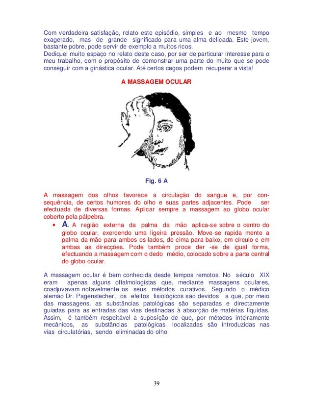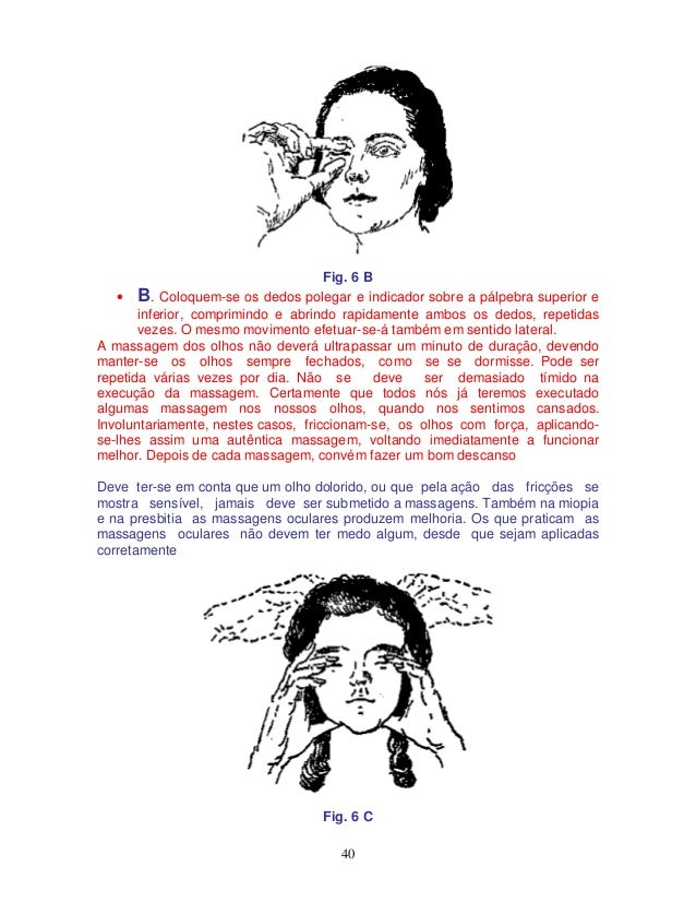 40. 40. 40 Fig. 6 B • B. Coloquem-se os dedos polegar e indicador sobre a pálpebra superior e inferior, comprimindo e abrindo rapidamente ambos os dedos, repetidas vezes. O mesmo movimento efetuar-se-á também em sentido lateral. A massagem dos olhos não deverá ultrapassar um minuto de duração, devendo manter-se os olhos sempre fechados, como se se dormisse. Pode ser repetida várias vezes por dia. Não se deve ser demasiado tímido na execução da massagem. Certamente que todos nós já teremos executado algumas massagem nos nossos olhos, quando nos sentimos cansados. Involuntariamente, nestes casos, friccionam-se, os olhos com força, aplicando- se-lhes assim uma autêntica massagem, voltando imediatamente a funcionar melhor. Depois de cada massagem, convém fazer um bom descanso Deve ter-se em conta que um olho dolorido, ou que pela ação das fricções se mostra sensível, jamais deve ser submetido a massagens. Também na miopia e na presbitia as massagens oculares produzem melhoria. Os que praticam as massagens oculares não devem ter medo algum, desde que sejam aplicadas corretamente Fig. 6 C