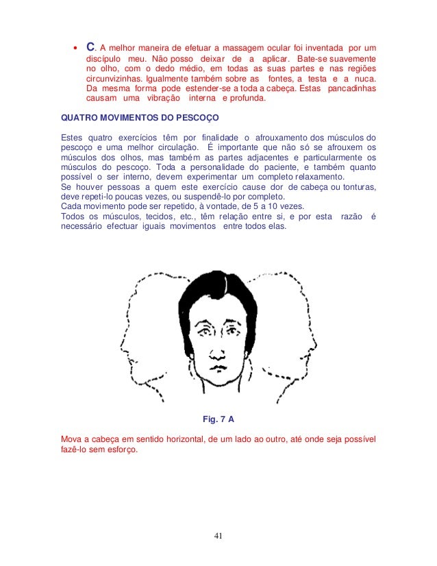 41. 41. 41 • C. A melhor maneira de efetuar a massagem ocular foi inventada por um discípulo meu. Não posso deixar de a aplicar. Bate-se suavemente no olho, com o dedo médio, em todas as suas partes e nas regiões circunvizinhas. Igualmente também sobre as fontes, a testa e a nuca. Da mesma forma pode estender-se a toda a cabeça. Estas pancadinhas causam uma vibração interna e profunda. QUATRO MOVIMENTOS DO PESCOÇO Estes quatro exercícios têm por finalidade o afrouxamento dos músculos do pescoço e uma melhor circulação. É importante que não só se afrouxem os músculos dos olhos, mas também as partes adjacentes e particularmente os músculos do pescoço. Toda a personalidade do paciente, e também quanto possível o ser interno, devem experimentar um completo relaxamento. Se houver pessoas a quem este exercício cause dor de cabeça ou tonturas, deve repeti-lo poucas vezes, ou suspendê-lo por completo. Cada movimento pode ser repetido, à vontade, de 5 a 10 vezes. Todos os músculos, tecidos, etc., têm relação entre si, e por esta razão é necessário efectuar iguais movimentos entre todos elas. Fig. 7 A Mova a cabeça em sentido horizontal, de um lado ao outro, até onde seja possível fazê-lo sem esforço.