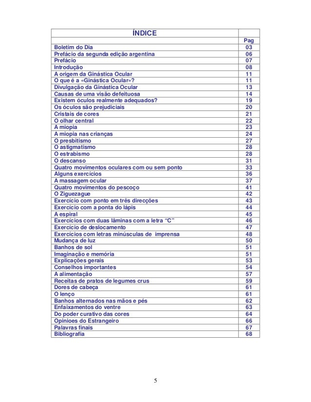5. 5. 5 ÍNDICE Pag Boletim do Dia 03 Prefácio da segunda edição argentina 06 Prefácio 07 Introdução 08 A origem da Ginástica Ocular 11 O que é a «Ginástica Ocular»? 11 Divulgação da Ginástica Ocular 13 Causas de uma visão defeituosa 14 Existem óculos realmente adequados? 19 Os óculos são prejudiciais 20 Cristais de cores 21 O olhar central 22 A miopia 23 A miopia nas crianças 24 O presbitismo 27 O astigmatismo 28 O estrabismo 28 O descanso 31 Quatro movimentos oculares com ou sem ponto 33 Alguns exercícios 36 A massagem ocular 37 Quatro movimentos do pescoço 41 O Ziguezague 42 Exercício com ponto em três direcções 43 Exercício com a ponta do lápis 44 A espiral 45 Exercícios com duas lâminas com a letra “C” 46 Exercício de deslocamento 47 Exercícios com letras minúsculas de imprensa 48 Mudança de luz 50 Banhos de sol 51 Imaginação e memória 51 Explicações gerais 53 Conselhos importantes 54 A alimentação 57 Receitas de pratos de legumes crus 59 Dores de cabeça 61 O lenço 61 Banhos alternados nas mãos e pés 62 Enfaixamentos do ventre 63 Do poder curativo das cores 64 Opinioes do Estrangeiro 66 Palavras finais 67 Bibliografia 68