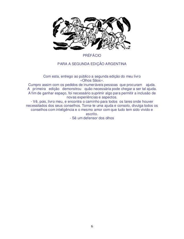 6. 6. 6 PRÉFÁCIO PARA A SEGUNDA EDIÇÃO ARGENTINA Com esta, entrego ao público a segunda edição do meu livro «Olhos Sãos». Cumpro assim com os pedidos de inumeráveis pessoas que procuram ajuda. A primeira edição demonstrou quão necessária pode chegar a ser tal ajuda. A fim de ganhar espaço, foi necessário suprimir algo para permitir a inclusão de novas experiências e aspectos. - Vê, pois, livro meu, e encontra o caminho para todos os lares onde houver necessitados dos seus conselhos. Torna-te uma ajuda e consolo, divulga todos os conselhos com inteligência e o mesmo amor com que tudo tem sido vivido e escrito. - Sê um defensor dos olhos
